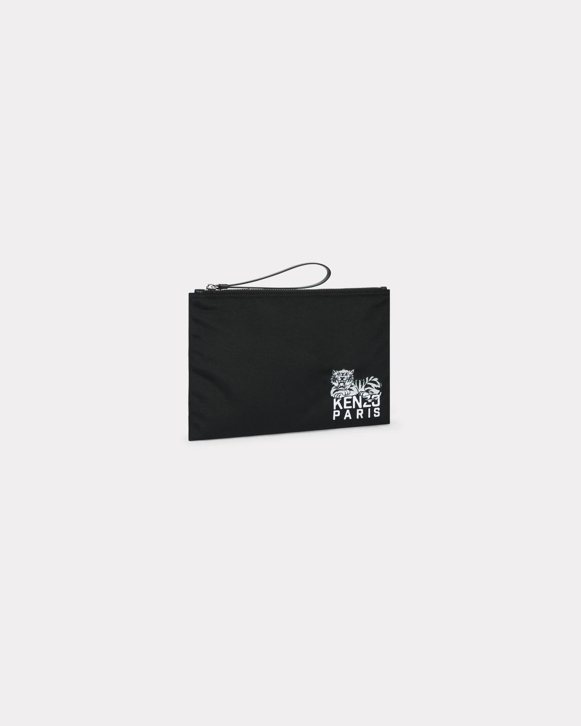 'KENZO Happy Tiger' large clutch. 'KENZO Varsity' line. Hand-carried. Zip fastener. Embroidered 'KENZO Happy Tiger' & 'KENZO Paris' logo. Product Reference: FF65PM612F29.99.TU SIZE & FIT Dimensions : 30 x 20 x 1.5 cm. Wrislet: 17 cm. COMPOSITION & CARE Made in Vietnam 100% polyester Do not dry-clean Do not wash