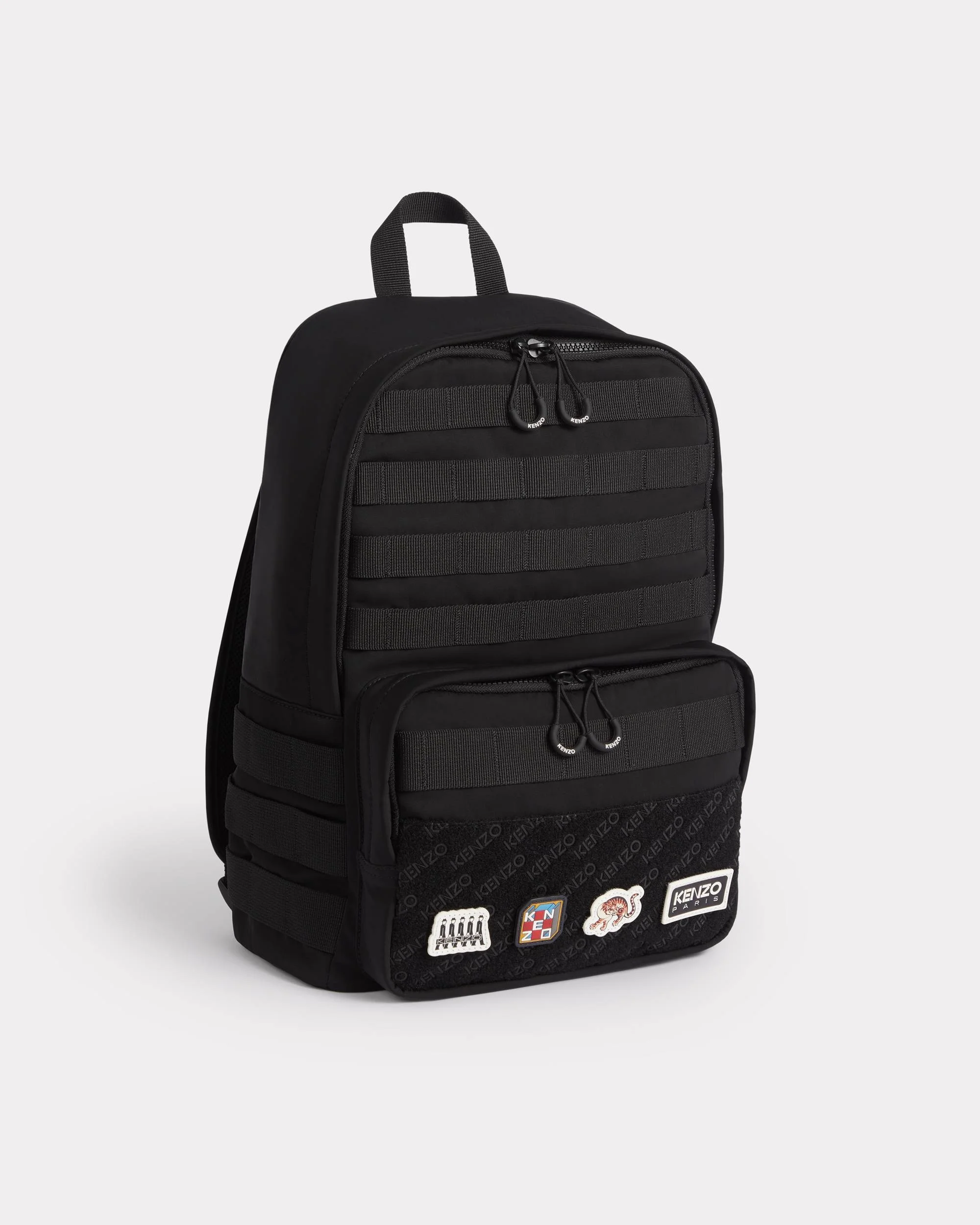 'KENZO Jungle' backpack. Adjustable shoulder straps. Top handle. Two-way zip fastener. Zip fastener for the front pocket. 1 inside computer compartment pocket. 1 inside flat pocket. 1 outside zipped pocket. 4 badges. Matt Black PVD. Detachable badges including KENZO Paris logo. Monogram on the velcro part. Branded zip pullers. Monogram jacquard lining. Carried as a backpack. Product Reference: FE65SA203F20.99.TU SIZE & FIT Dimensions : 30 x 41 x 19 cm. COMPOSITION & CARE Made in China 69% polyester, 31% nylon Do not bleach Do not dry-clean Do not iron Do not dry Do not tumble dry Do not wash Do not wet-clean