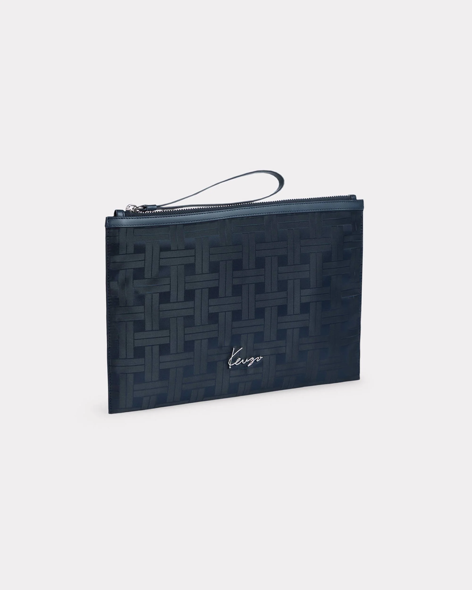 'KENZO Mura' large clutch. Hand-carried. Zip fastener. Shiny nickel. 'KENZO Weave' pattern with jacquard technique. Handwritten KENZO signature in metal. Product Reference: FF65PM502F22.79.TU SIZE & FIT Dimensions: 30 x 20 x 1.5 cm. Wrislet : 17 cm. COMPOSITION & CARE Made in Vietnam 100% polyester Do not bleach Do not dry-clean Do not iron Do not dry Do not tumble dry Do not wash Do not wet-clean