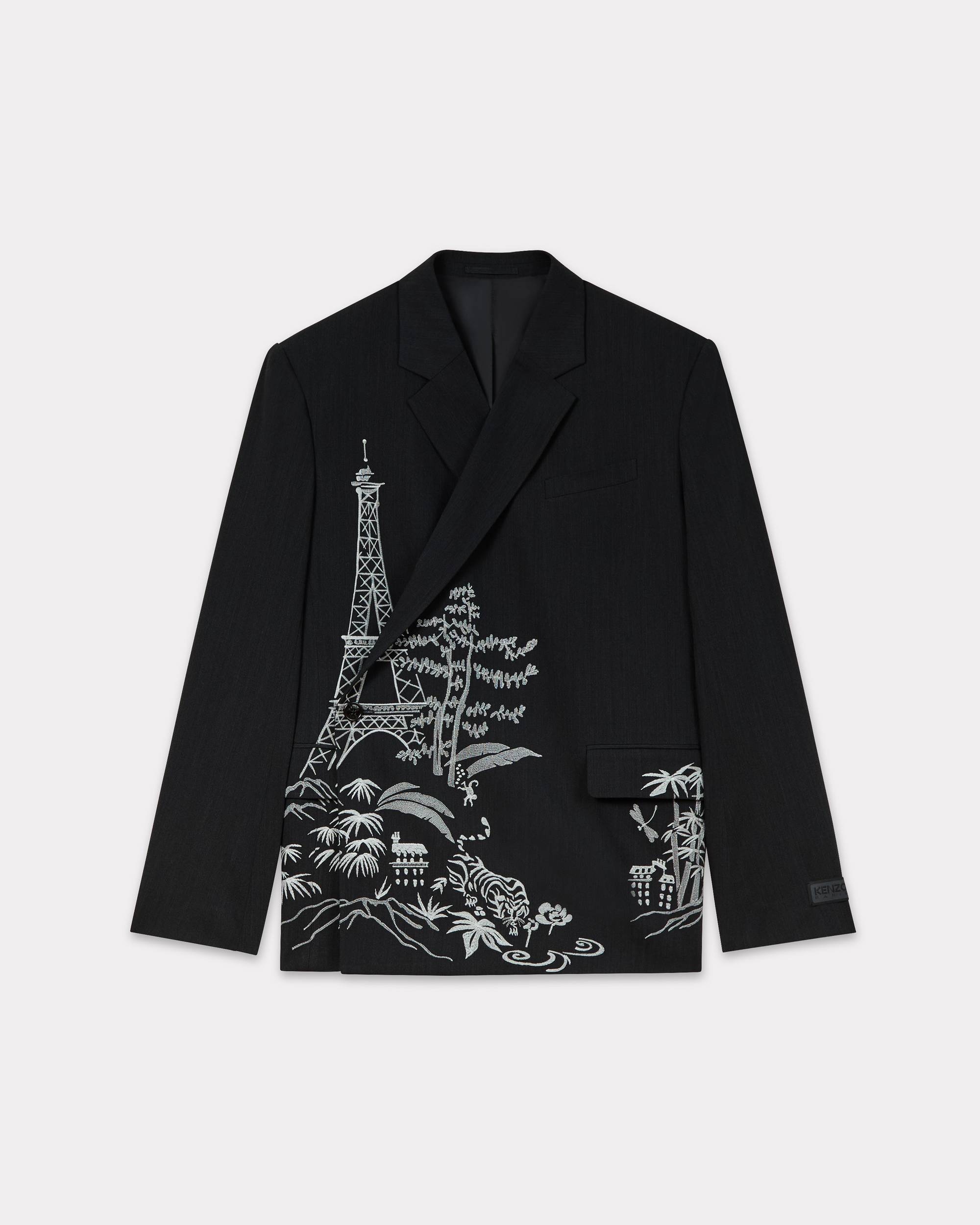 This piece is a new interpretation of the kimono blazer, highlighting the House's Japanese origins. Embroidered with the 'KENZO PARIS JUNGLE' graphic inspired by traditional oriental paintings, the city of Paris is set against a backdrop of greenery. 'KENZO Paris Jungle' embroidered tailored kimono jacket . ‘KENZO Paris Jungle’ embroidery. Removable KENZO logo on the cuff. Half lined. Featuring under collar felt & lining. One chest pocket. One flap pocket. Two inside pocket. Product Reference: FF55VE1429RI.99 SIZE & FIT The model is 185 cm tall and is wearing a size M. Back length at 74 cm. COMPOSITION & CARE Made in Portugal 72% viscose, 28% virgin wool Do not bleach Mild professional dry-cleaning in: hydrocarbons Iron at low temperature Line drying in the shade Do not tumble dry Do not wash Do not wet-clean
