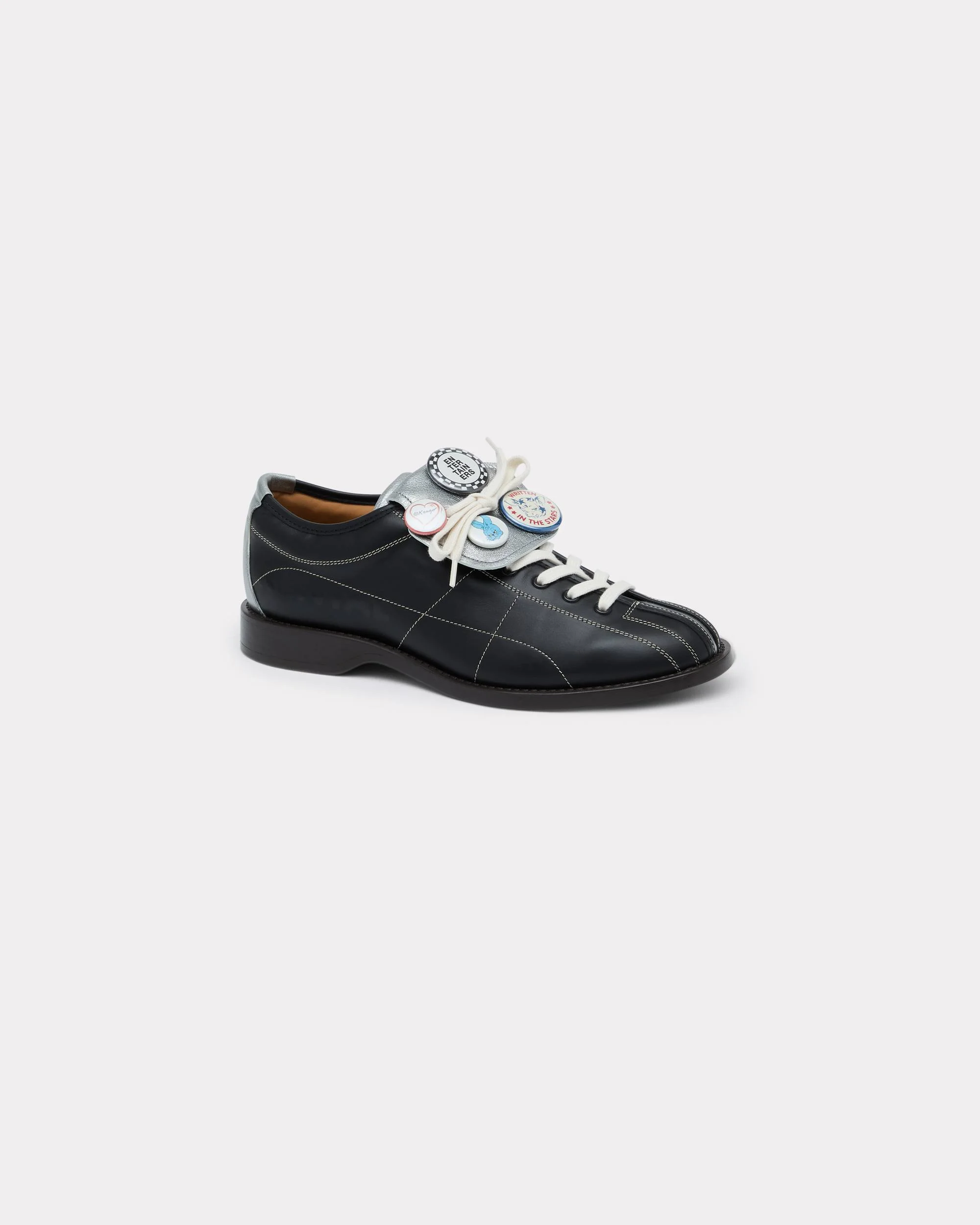 These derbies, signed 25 - a nod to the brand's artistic director Nigo, whose name translates as '2-5' in Japanese - look back to the world of retro bowling through a contemporary lens. Crafted in Italian nappa leather, they feature decorative top-stitching and 'RENTAL' lettering on the side. The tongue is embellished with the 'Kenzo Archive' branding, while the rubber sole guarantees maximum comfort. 'KENZO Striker' bowling derbies in leather. Calf leather lining. Sole in gum. KENZO Paris signature on the back of the heel. "2" and "5" ("ni" and "go" in japanese) signature on the back of the heel. KENZO archive signature on the tongue. "Rental" inscription on the external side and decorative stitching referencing the bowling inspiration. Comes with a removable flap with badges. Product Reference: FG55DB120L50.99 SIZE & FIT Sole: 2 cm. COMPOSITION & CARE Made in Italy 100% cow leather