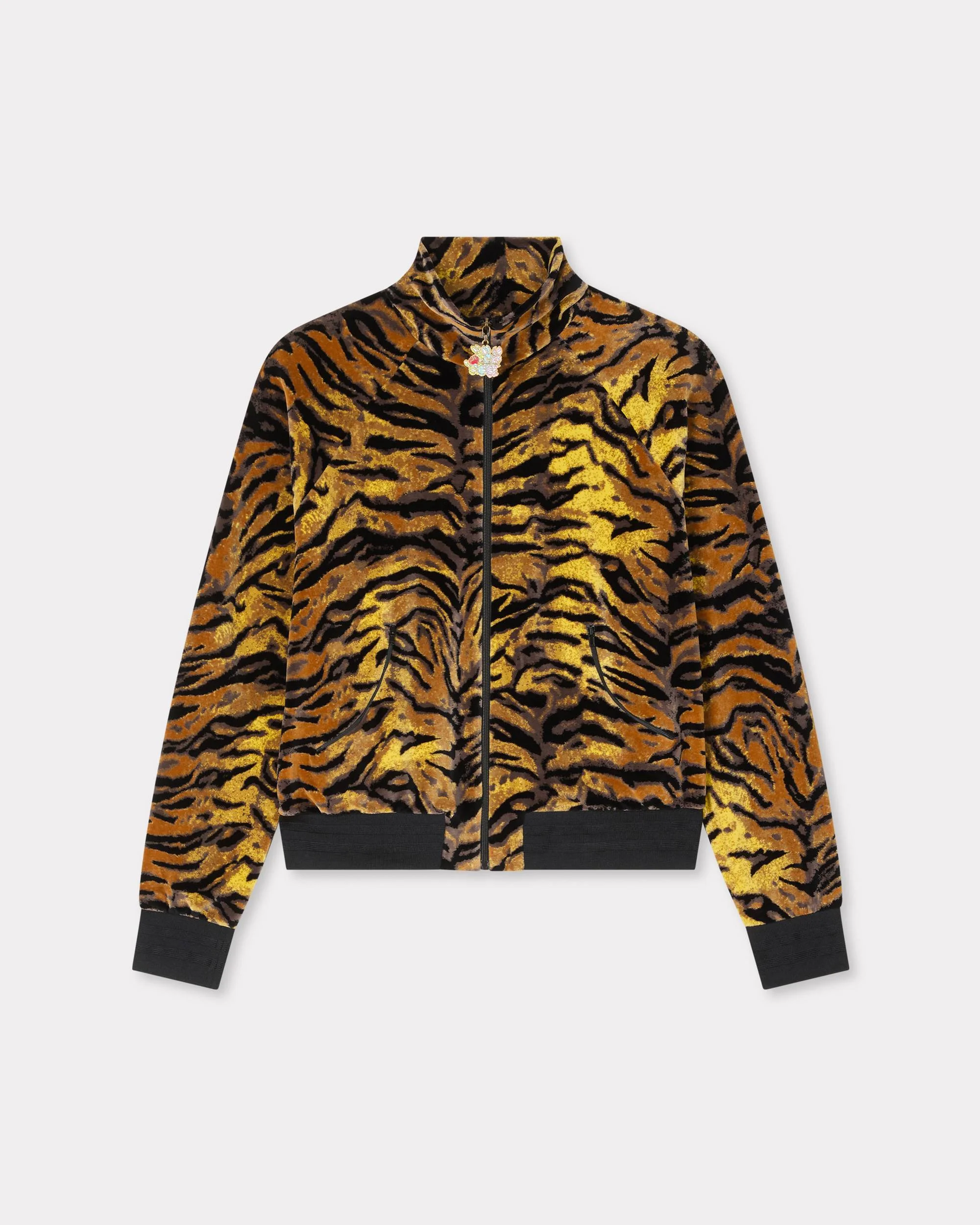 'KENZO Tiger' track jacket. Velvet jacquard. Two zipped side pockets. Two-way zip. Cartoon puller. Contrasted ribs. All over printed tiger pattern. KENZO Archive signature embroidered at low back. Product Reference: FG55SW5164JG.41 SIZE & FIT The model is 185 cm tall and is wearing size M. This item fits true to size. Take your usual size. COMPOSITION & CARE Made in Portugal 82% cotton, 18% polyamide Do not bleach Do not dry-clean Iron at low temperature Line drying in the shade Do not tumble dry 30°C mild fine wash Mild professional wet-cleaning