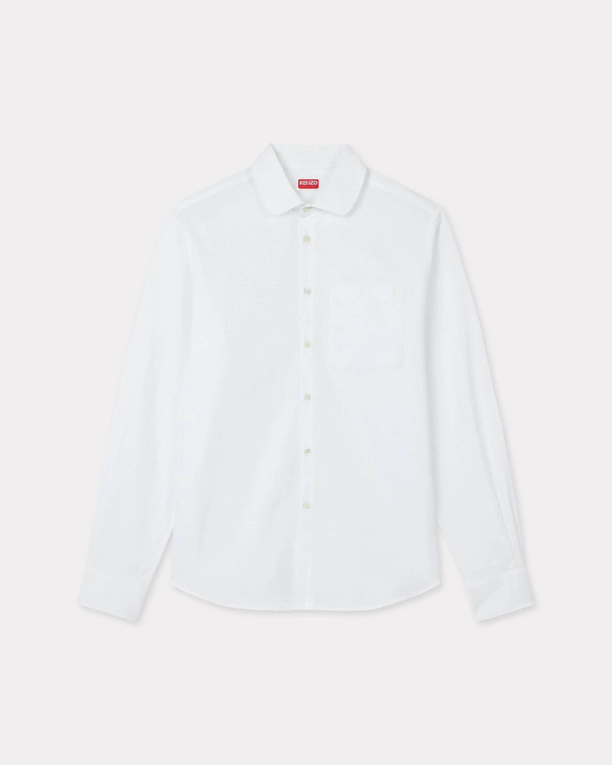 'KENZO Weave' slim shirt in cotton jacquard. Cotton jacquard. 'KENZO Paris' signature hidden in the pattern. Club collar. Product Reference: FF55CH2029JA.01 SIZE & FIT Slim fit. Back length at 79 cm. The model is 185 cm tall and is wearing size M. COMPOSITION & CARE Made in Tunisia 100% cotton Do not bleach Mild professional dry-cleaning in: hydrocarbons Iron at low temperature Line drying in the shade Do not tumble dry 30°C very mild fine wash Very mild professional wet-cleaning