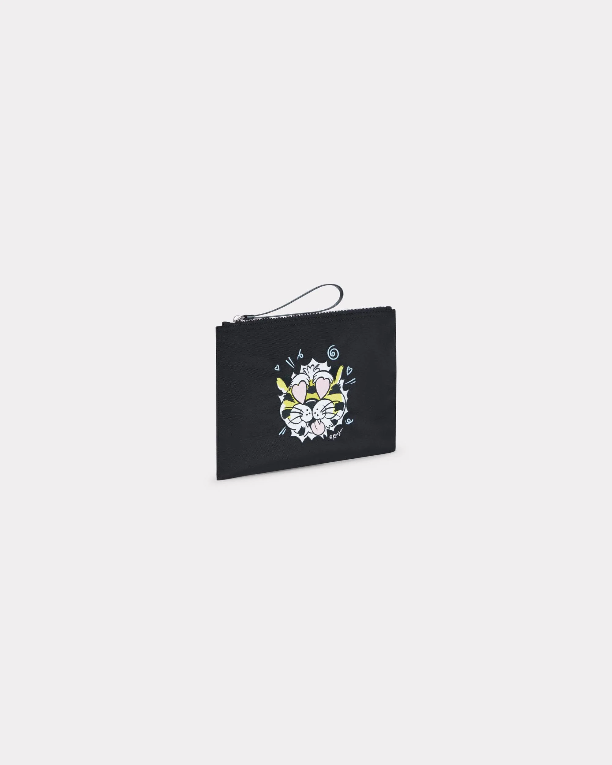 'KENZO Wild Tiger' large clutch. 'KENZO Varsity' line. Nylon. Wrislet. Zip fastener. Embroidered 'KENZO Wild Tiger'. Hand-carried. Product Reference: FG55PM602F21.99.TU SIZE & FIT Dimensions: 30 x 20 x 1.5 cm. Wrislet: 17 cm. COMPOSITION & CARE Made in Vietnam 100% polyester Do not bleach Do not dry-clean Do not iron Do not dry Do not tumble dry Do not wash Do not wet-clean