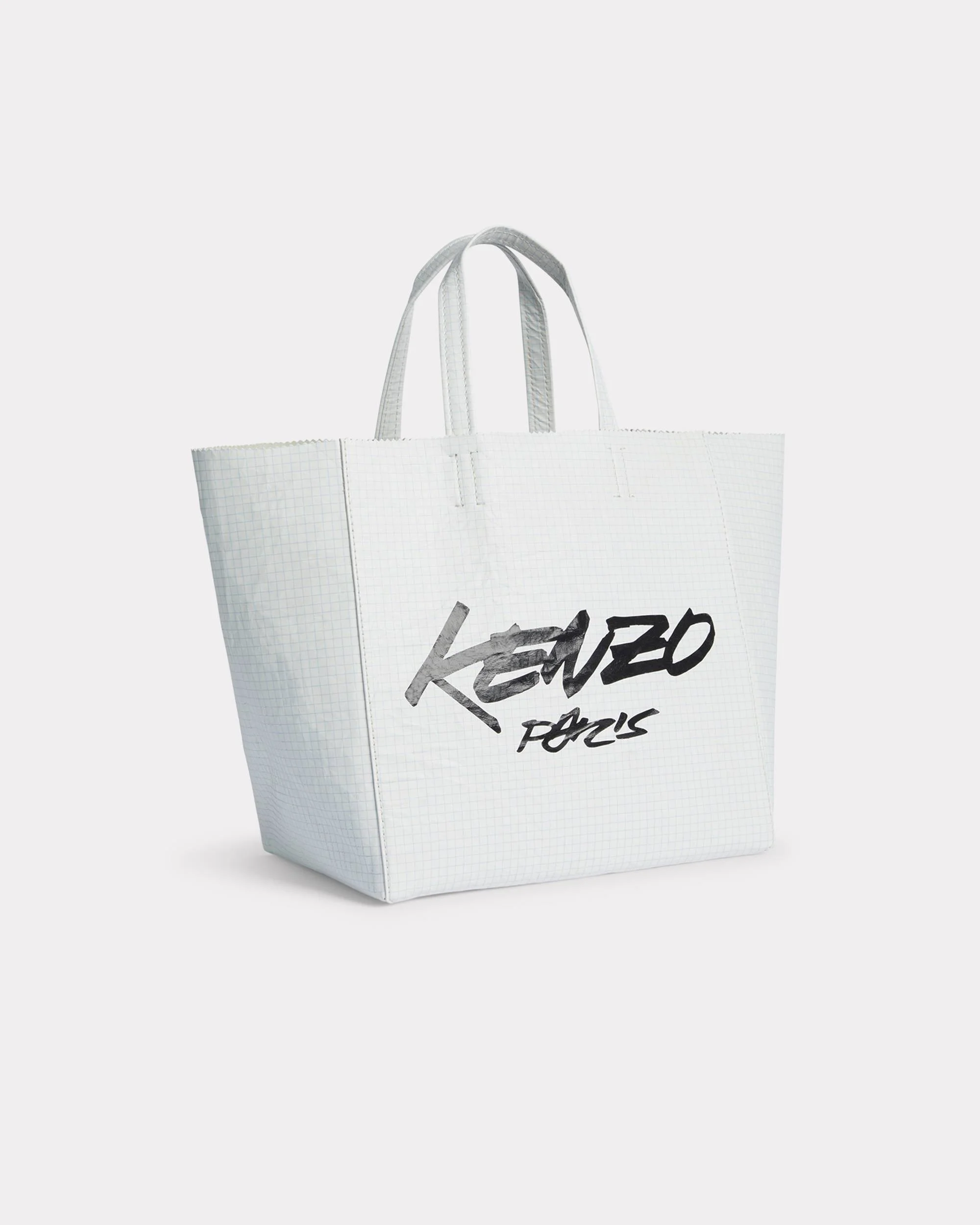 Inspired by a paper bag silhouette, this Italian leather model, with its grid pattern reminiscent of a school notebook, pays homage to the fashion house's FW81–82 fashion show, when the models walked in paper bags. The design is finished with the 'Kenzo Paris' logo on one side and the words '18 Rue Vivienne Paris' on the other, reinterpreted in graffiti style by the artist Futura 2000 as part of his collaboration with the house. 'Kenzo x Futura 2000' small tote bag 'Kenzo Paper' in leather. 'Kenzo x Futura 2000' collection. Hand-carried. 2 handles. 1 inside hanging zipped pocket in leather. 'Kenzo Paris' on the front. 18 rue Vivienne on the back. Product Reference: FF62SA110L07.01.TU SIZE & FIT Dimensions: 26 x 36 x 16.5 cm. Handles drop length: 13 cm. COMPOSITION & CARE Made in Tunisia 100% goat leather Do not iron