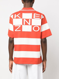 logo-print striped polo shirt orange/white cotton fine ribbed horizontal stripe pattern logo patch at the chest logo print to the rear polo collar short front button fastening short sleeves straight hem Made in Italy Composition Cotton 100% SIZE & FIT Model measurements Height 6 ft 0 in(1.84 m) Bust/Chest 36.22 in(92 cm) Hips 35.43 in(90 cm) Waist 26.77 in(68 cm) FittingInformation This piece fits true to size. We recommend you get your regular size Cut for a relaxed fit Made with a mid-weight fabric Washing instructions Machine Wash