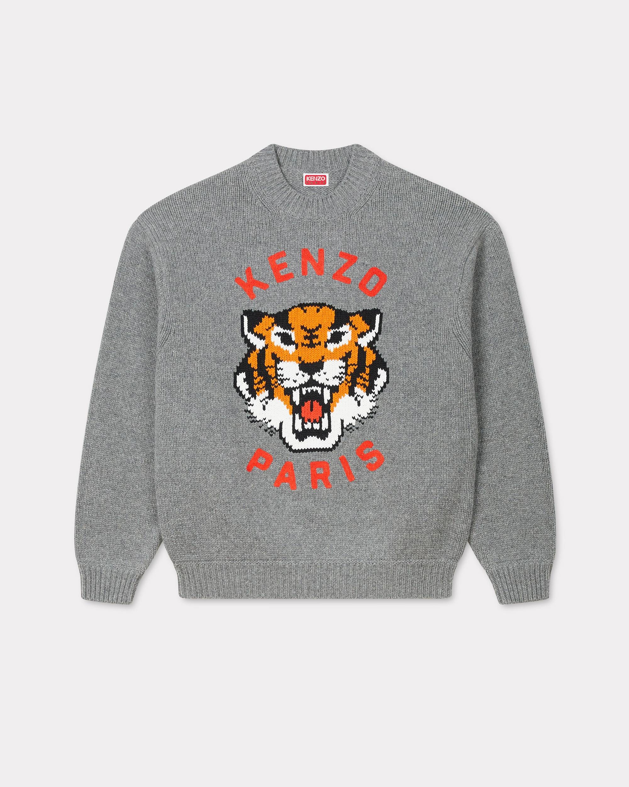 'Lucky Tiger' embroidered jumper. Comfortable cut. Intarsia tiger, with KENZO Paris embroidered. Product Reference: FE68PU4773LH.97 SIZE & FIT The female model is 175 cm tall and is wearing size S. The male model is 185 cm. tall and is wearing size M. COMPOSITION & CARE Made in China 93% wool, 6% cotton, 1% nylon Do not bleach Mild professional dry-cleaning in: hydrocarbons Iron at low temperature Flat drying in the shade Do not tumble dry Hand wash Very mild professional wet-cleaning