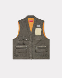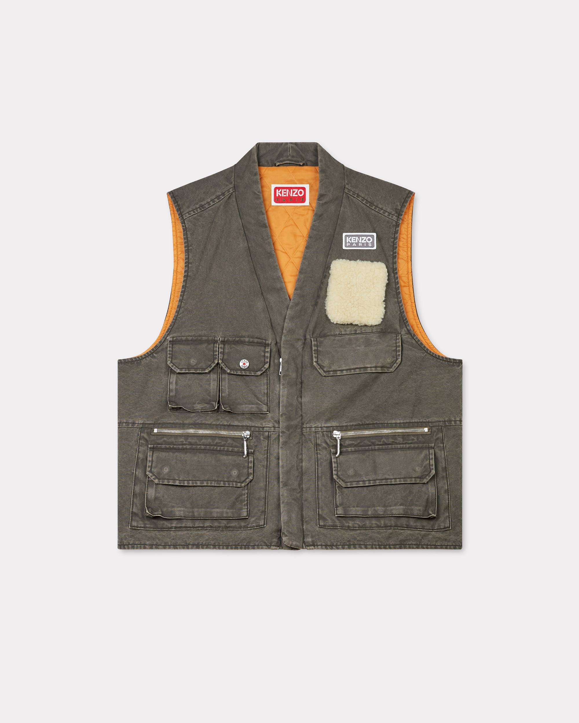 Multipocket gilet. 7 front pockets (zipped or flat). Contrasted quilting. Adjustable side tabs. KENZO Paris label on the front chest. Boke Flower button snap front pocket. Lined. Wadded. Five flap pockets. Two zipped pockets. Product Reference: FE65VE0089GK.92 SIZE & FIT Boxy fit. Back length at 65 cm. The male model is 185 cm tall and is wearing size M. COMPOSITION & CARE Made in Tunisia 100% cotton Do not bleach Mild professional dry-cleaning in: hydrocarbons Iron at low temperature Line drying in the shade Do not tumble dry Do not wash Do not wet-clean