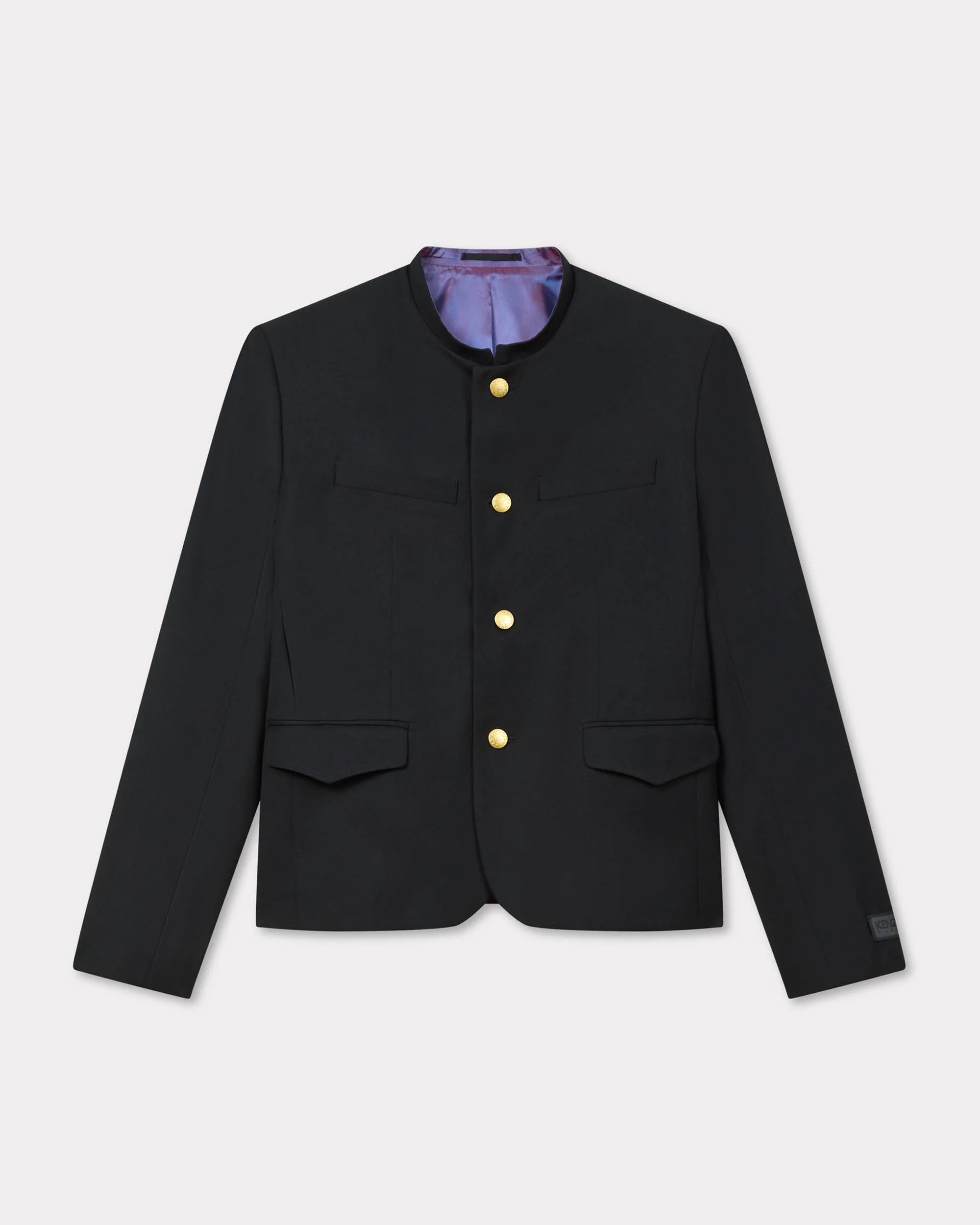 School boy tailored jacket. Contrasted lining. Hook and eye collar. Boning inside the collar. Removable 'KENZO Paris' label on the cuff. Two chest pockets. Two patch pockets. One small coin pocket. Three inside pockets. Product Reference: FF65VE1189RD.99 SIZE & FIT The model is 185 cm tall and is wearing size M. Back length at 66 cm. Fitted fit. The fit of this product is fitted. We recommend choosing one size larger than your usual size. COMPOSITION & CARE Made in Romania 55% polyester, 45% virgin wool Mild professional dry-cleaning in: hydrocarbons Line drying in the shade Do not tumble dry Do not wet-clean