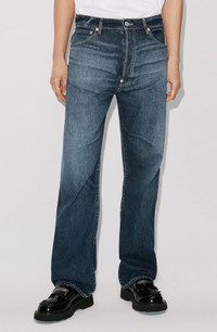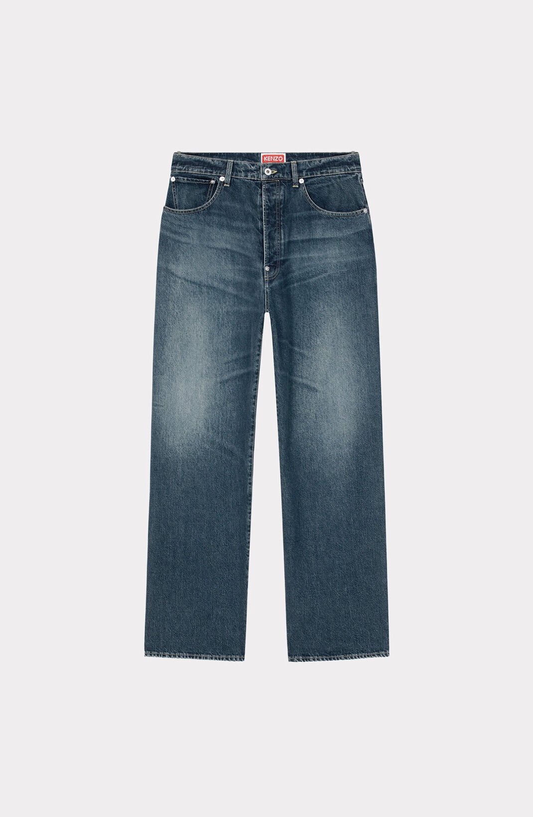 These trousers celebrate the timeless appeal of jeans, in particular those made of Japanese denim from the famous house of Kaihara. On this relaxed-fit design, the iconic material has been given a bold wash for vintage urban appeal. Faded jeans made of Japanese Kaihara denim. Relaxed fit with mid-rise waist. KENZO Paris jacron on the back. 1 ticket pocket and 2 round pockets on the front. 2 patch pockets on the back. Belt loops. Zip and button fastening. SIZE & FIT Mid-rise waist. Relaxed fit. Leg length: 114 cm. COMPOSITION & CARE Made in Tunisia 100% cotton