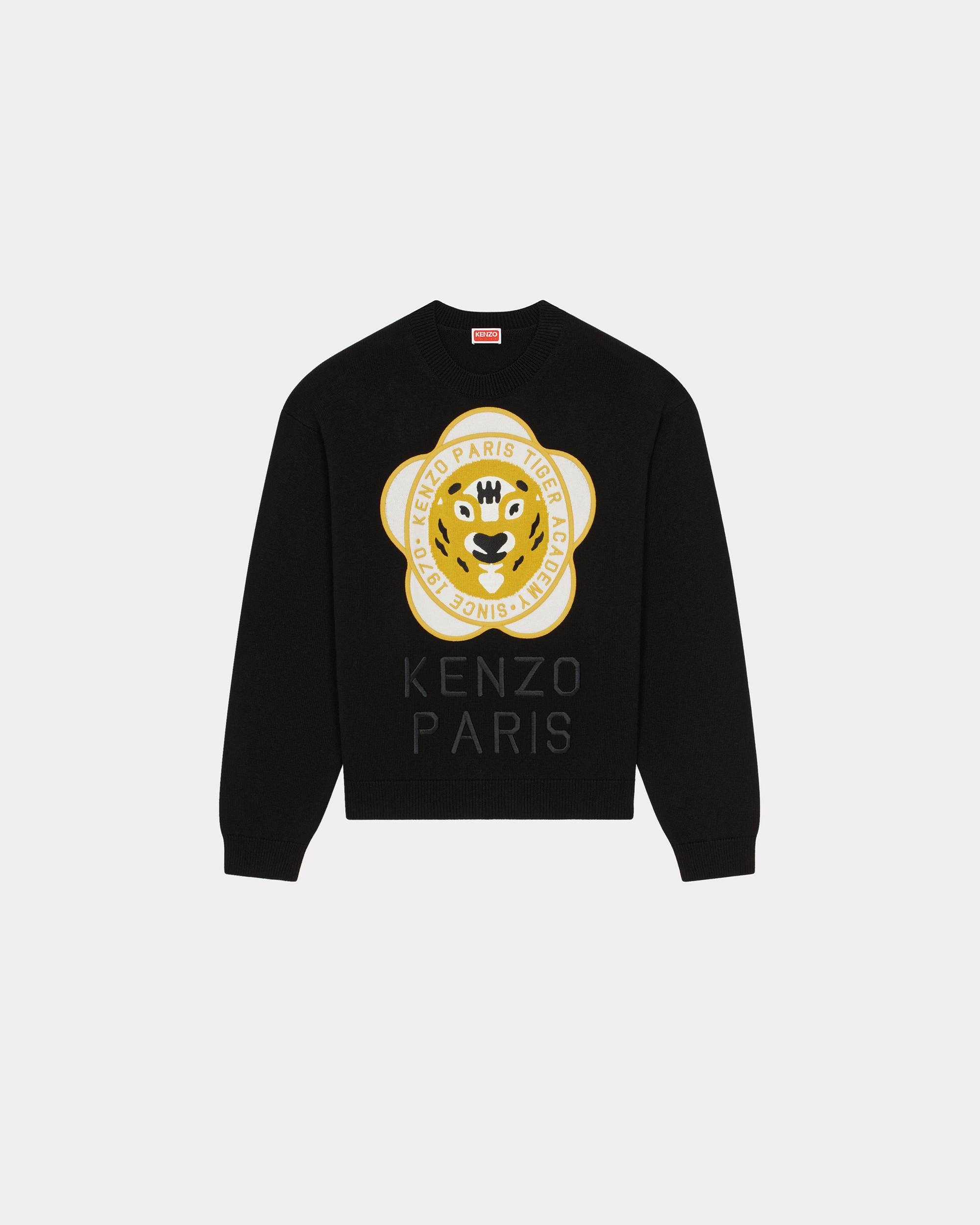This jumper features the 'KENZO Tiger Academy' emblem inspired by university logos. The embroidered 1970 design references the year the first KENZO boutique opened. A central piece for every streetwear wardrobe, this jumper offers a casual style thanks to its dropped shoulders. 'KENZO Tiger Academy' RWS wool-blend jumper. Long sleeves. Round neck. 'Kenzo Tiger Academy' and KENZO Paris embroidered motifs on front. Ribbed neck, cuffs and hem. Dropped shoulder seams. SIZE & FIT Casual cut. The model is 185 cm tall and wears a size M. COMPOSITION & CARE Made in China 55% wool, 45% cotton
