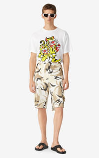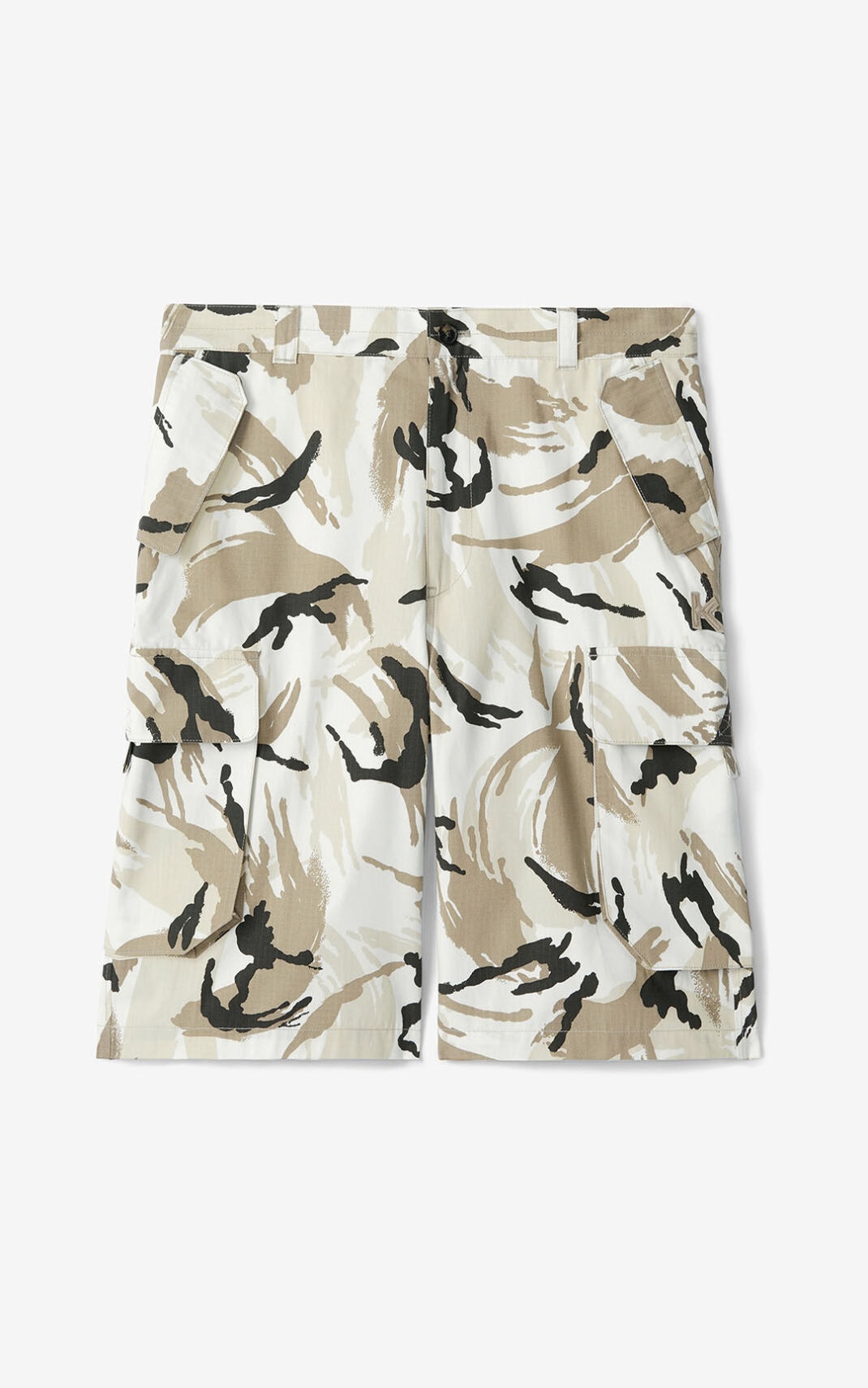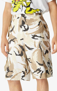 These cargo shorts are all about nature with their all-over camouflage print. The practical knee-length design features multiple pockets. Pair these shorts with a plain lightweight jumper or shake things up by wearing them with one of our printed T-shirts. Cargo shorts. All-over ‘Tropic Camo' print. K embroidery on left side. Flap pockets on the sides of the legs. Back pockets. Size & fit Cargo cut. Composition & care Made in Romania 100% cotton