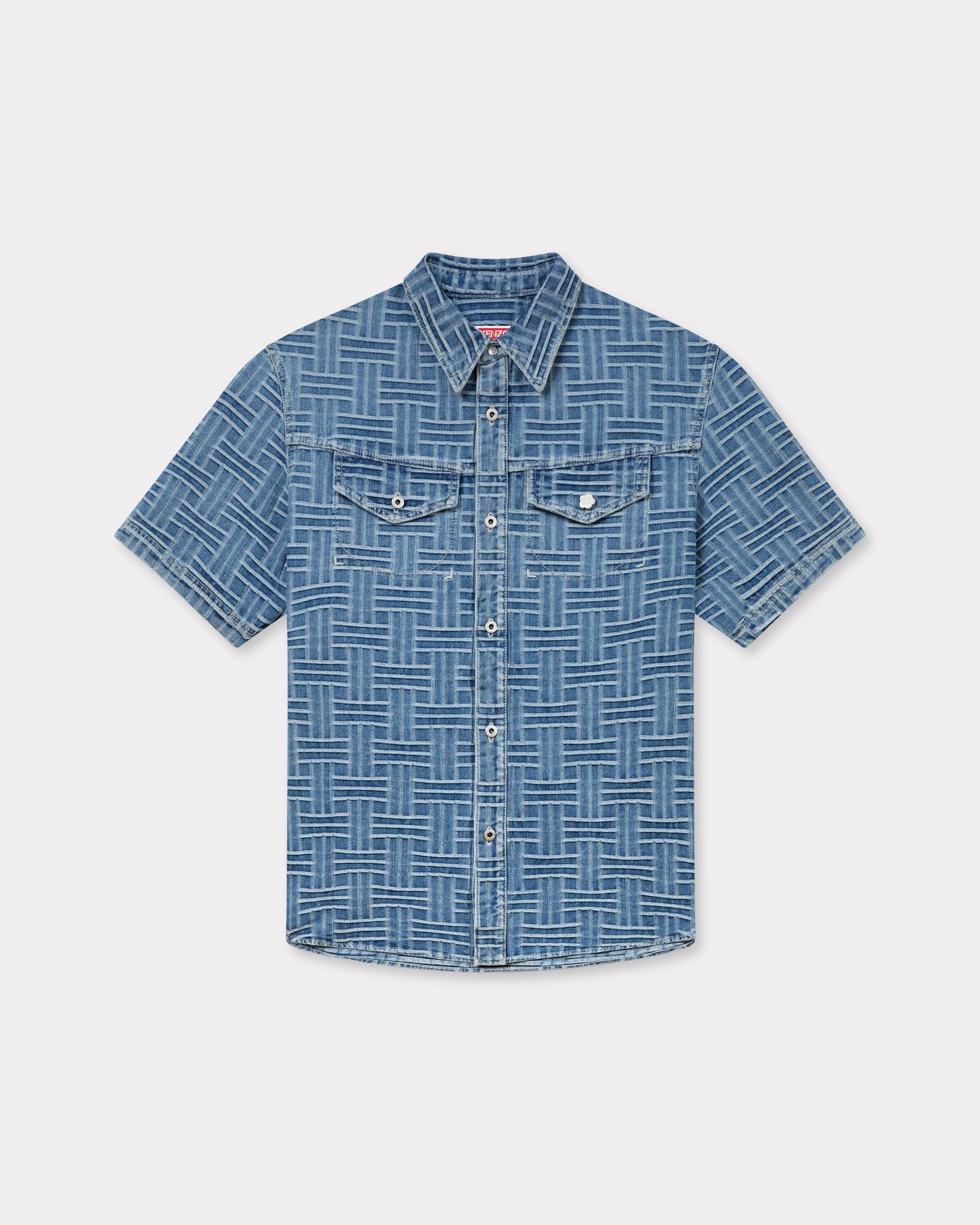 This short-sleeved shirt features an all over "Kenzo Weave" pattern on textured denim. Nigo has revisited and modernised the 'Kenzo Weave' motif, inspired by the traditional Japanese fireman's coat known as 'Hikeshi baten'. The stone-washing technique gives offers nuanced tones, making each piece unique. 'KENZO Weave' shirt in japanese denim. Dova Japanese denim. Textured jacquard. 'KENZO Paris' leather jacron on the back neck. Pearly snap collar button. Two chest pockets. Product Reference: FF55DC1026J4.DB SIZE & FIT The model is 185 cm tall and is wearing size M. Back length at 78 cm. Casual fit. COMPOSITION & CARE Made in Tunisia 100% cotton Do not bleach Mild professional dry-cleaning in: hydrocarbons Iron at low temperature Line drying in the shade Do not tumble dry 30°C very mild fine wash Very mild professional wet-cleaning