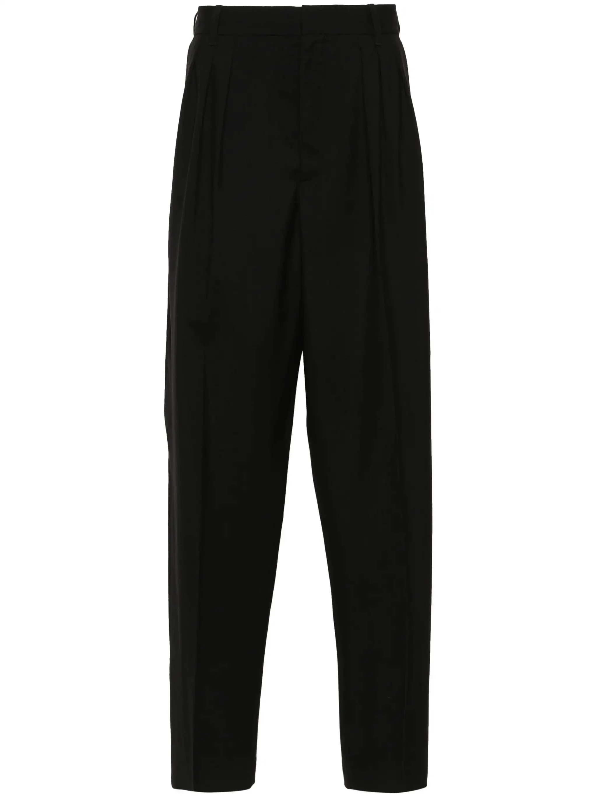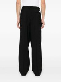 BLACK VIRGIN WOOL BELT LOOPS PLEAT DETAILING TWO SIDE SLASH POCKETS LOGO PATCH TO THE REAR REAR WELT POCKET CONCEALED FRONT BUTTON, HOOK AND ZIP FASTENING