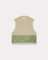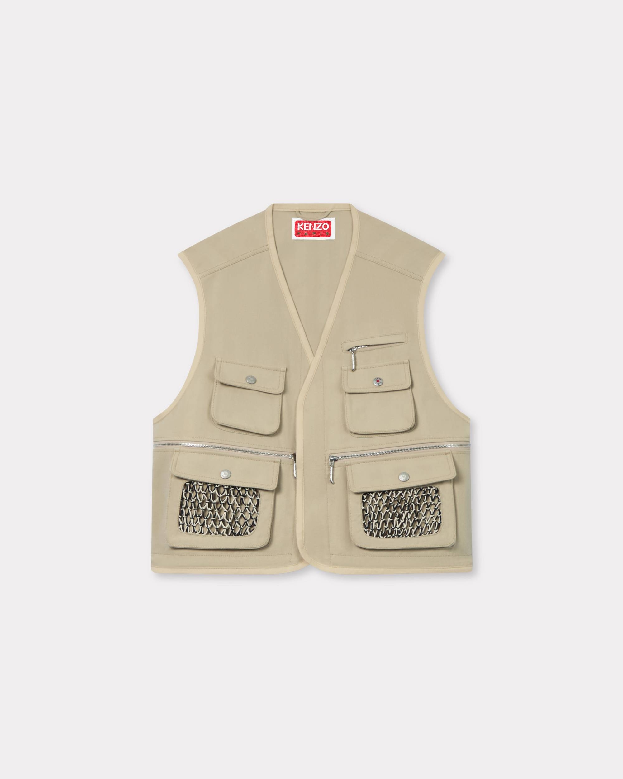 Workwear gilet. Herringbone organic cotton. Hand made mesh on the front pockets. Technical details with invisible snaps and bottom drawstrings. 'KENZO Paris' label on the back neck. Boke button on the chest and tiger tails zippers. Two flap chest pockets. One zipped chest pocket. Two zipped front pockets. Two front flap pockets. Product Reference: FF55OU0099OT.11 SIZE & FIT The model is 185 cm tall and is wearing size M. Back length at 59 cm. Boxy shape. COMPOSITION & CARE Made in Tunisia 100% cotton Do not bleach Mild professional dry-cleaning in: hydrocarbons Iron at low temperature Line drying in the shade Do not tumble dry Do not wash Do not wet-clean