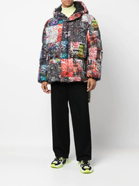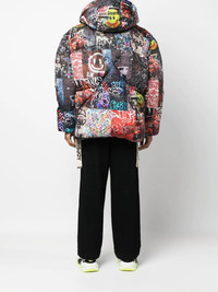 graffiti-print down puffer jacket multicolour feather down graffiti print classic hood high neck concealed front fastening two side zip-fastening pockets long sleeves straight hem Made in Italy Composition Outer: Polyester 100% Lining: Polyester 100%, Feather Down 100% SIZE & FIT Model measurements Height 6 ft 2 in(1.87 m) Bust/Chest 38.18 in(97 cm) Hips 36.61 in(93 cm) Waist 29.13 in(74 cm) FittingInformation This piece fits true to size. We recommend you get your regular size Cut for a loose fit Made with a mid-weight non-stretch fabric Washing instructions Hand Wash