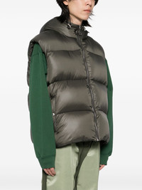 hooded gilet Highlights - Dark green - Front zip fastening - Two press-stud fastening side pockets - Drawstring hem - Internal zip-fastening pocket Made in Italy Composition Outer: Polyamide 100% Lining: Polyamide 100% Duck Down 90%, Duck Feathers 10% SIZE & FIT Model measurements Height 6 ft 2 in(1.87 m) Bust/Chest 33.07 in(84 cm) Hips 35.43 in(90 cm) Waist 26.77 in(68 cm) FittingInformation Designed for a boxy fit, intended for a loose fit throughout The internal drawstring at the hem allows for fitted preferences Made from a padded non-stretch fabric, giving it no natural elasticity