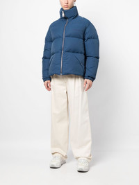 logo-print padded jacket Highlights - Cobalt blue - Down-feather filling - Padded design - Logo print at the chest - Funnel neck - Front zip fastening - Long sleeves - Elasticated cuffs - Two side stud-fastening pockets - Straight hem Made in Italy Composition Outer: Cotton 64%, Polyamide 36% Lining: Polyester 100% Filling: Down 80%, Feather 20% SIZE & FIT Model measurements Height 6 ft 2 in(1.89 m) Bust/Chest 37.4 in(95 cm) Hips 36.61 in(93 cm) Waist 28.34 in(72 cm) FittingInformation Designed to be unstructured, offering a loose fit throughout Made from a padded non-stretch fabric, giving it no natural elasticity This piece fits true to size – take your usual size Washing instructions Hand Wash