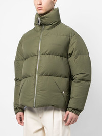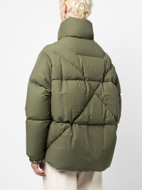 logo-print padded jacket Highlights - Moss green - Down-feather filling - Padded design - Logo print at the chest - Funnel neck - Front zip fastening - Long sleeves - Elasticated cuffs - Two side stud-fastening pockets - Straight hem Made In Italy Composition Outer: Cotton 64%, Polyamide 36% Lining: Polyester 100% Filling: Down 80%, Feather 20% SIZE & FIT Model measurements Height 6 ft 2 in(1.89 m) Bust/Chest 37.4 in(95 cm) Hips 36.61 in(93 cm) Waist 28.34 in(72 cm) FittingInformation Designed to be unstructured, offering a loose fit throughout Made from a padded non-stretch fabric, giving it no natural elasticity This piece fits true to size – take your usual size