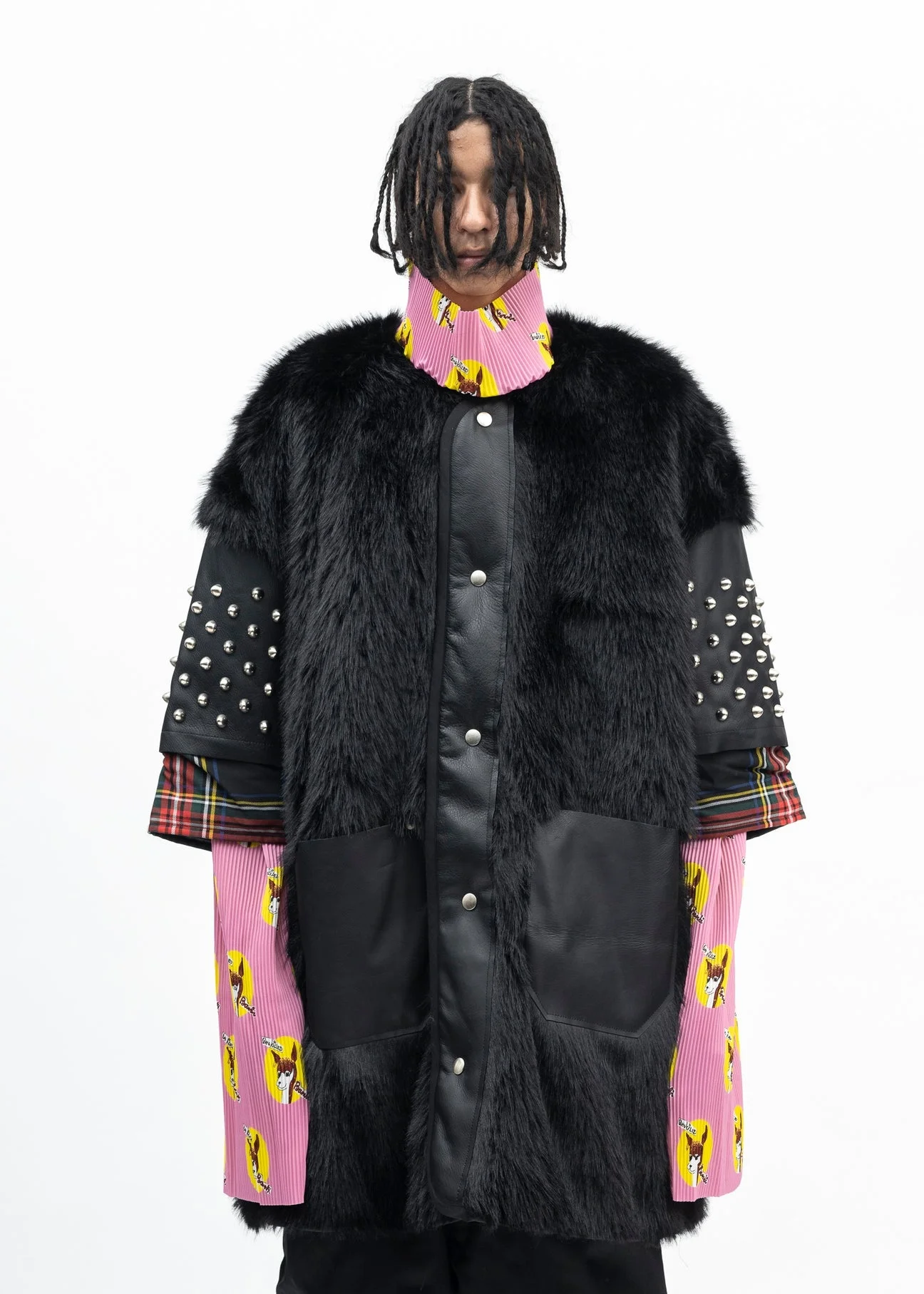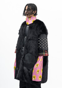 Faux-fur studded 3/4 length sleeve coat in black, from KIDILL. Features a an oversized panelled layered construction with a faux fur shell, studded leather sleeves, and plaid print cuffs. Silver-tone press-stud fastening along the front face. Tonal stitching and lining throughout. Oversized fit Shell 1: 100% Polyester Shell 2: Cow Leather Shell 3: 65% Polyester, 35% Rayon Lining: 100% Polyester Padding: 100% Polyester Detail: Metal Made in Japan Model is wearing size 44 Model is 6’ (183 cm), 125 pounds (56 kg), usually wears M in tops. A size 30 in denim and 46 in trousers. Size 10 in shoes. *FINAL SALE*