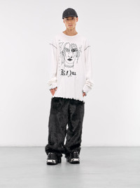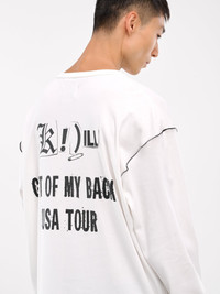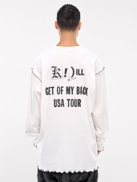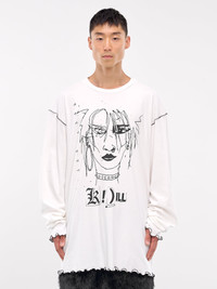 KIDILL t-shirt in white, paneled cotton construction, graphic print, ruffled hems throughout, contrast stitching, crewneck, long sleeves, relaxed fit. Made in Japan 100% Cotton One Size Model is 6'1" wearing size OS. Shoulders: 18" Chest: 36" Waist: 28"