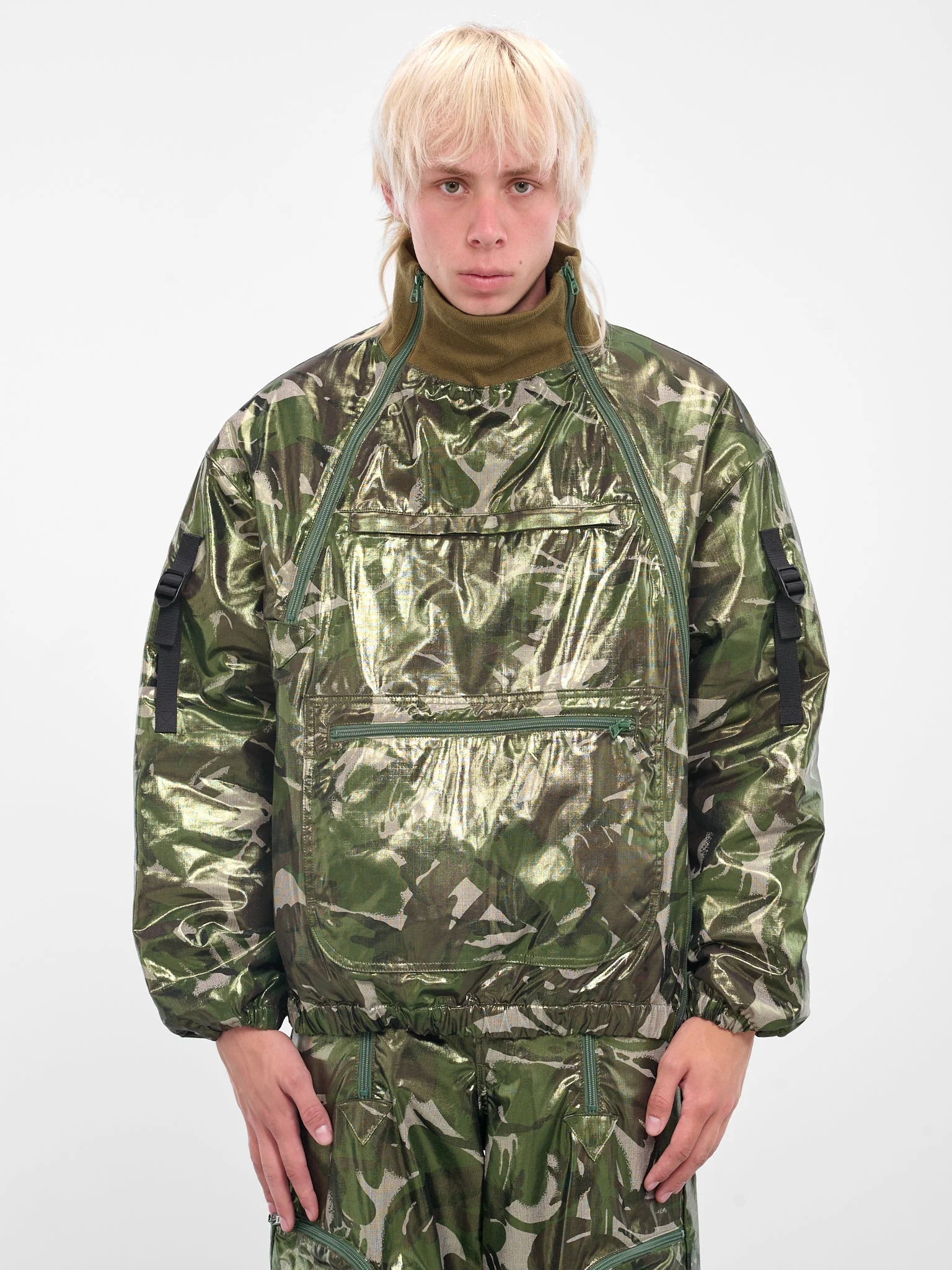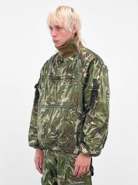 This green bomber jacket stands out with its camouflage pattern, coated surface, and rib-knit high neck with collar zips. Sculptural buckled sleeve straps and an oversized cut give a bold utilitarian finish. Featuring: • Oversized fit • Camouflage pattern with coated finish • Rib-knit high neck with front zip and collar zips • Adjustable buckled straps at sleeves • Elasticated cuffs and hem • Front zip pocket • Lined construction • Made in Japan • Outer: 100% Cotton | Lining: 100% Polyester • Italian sizing