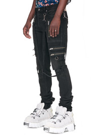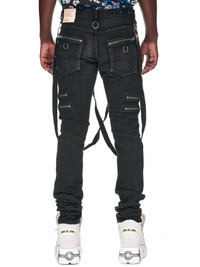 KIDILL jeans in black, distressed denim construction, straps, & ring details, mid-rise, belt loops, button-fly, side & zip pockets, back logo leather patch, skinny fit. Made in Japan European Sizing 97% Cotton, 3% Polyurethane Model is 6’0” wearing size 46. Shoulders: 18.5” Chest: 36” Waist: 30”