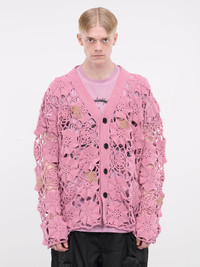 KIDILL sweater in pink, cardigan design, cotton-acrylic blend, paneled knit construction, spiderweb & spider graphic knit pattern, open knit, v-neckline, long sleeves, front buttoned placket closure, straight hem, oversized fit. Made in Japan 60% Cotton 40% Acrylic One Size Model is 6'1" wearing size OS. Shoulders: 18" Chest: 17.5" Waist: 30"