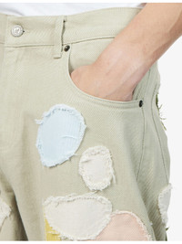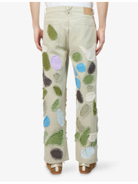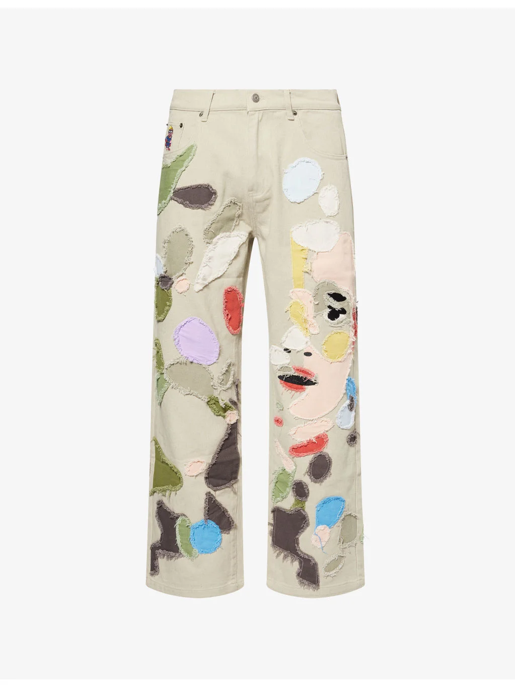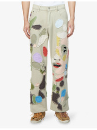 PRODUCT DETAILS - Kidsuper denim jeans - 100% cotton - Button and zip-fly fastening - Regular fit, mid-rise, straight leg, structured waistband with belt loops, five pockets, brand patch at back, all-over patchwork design, contrast embroidery, branded hardware - Machine wash cold - Size medium: rise 11.5in / 29cm, inside leg 30in / 76cm, leg opening 20in / 51cm - Model is 6ft 2in/1.88m and wears a size medium - Midweight, non-stretch Ref: R04523111