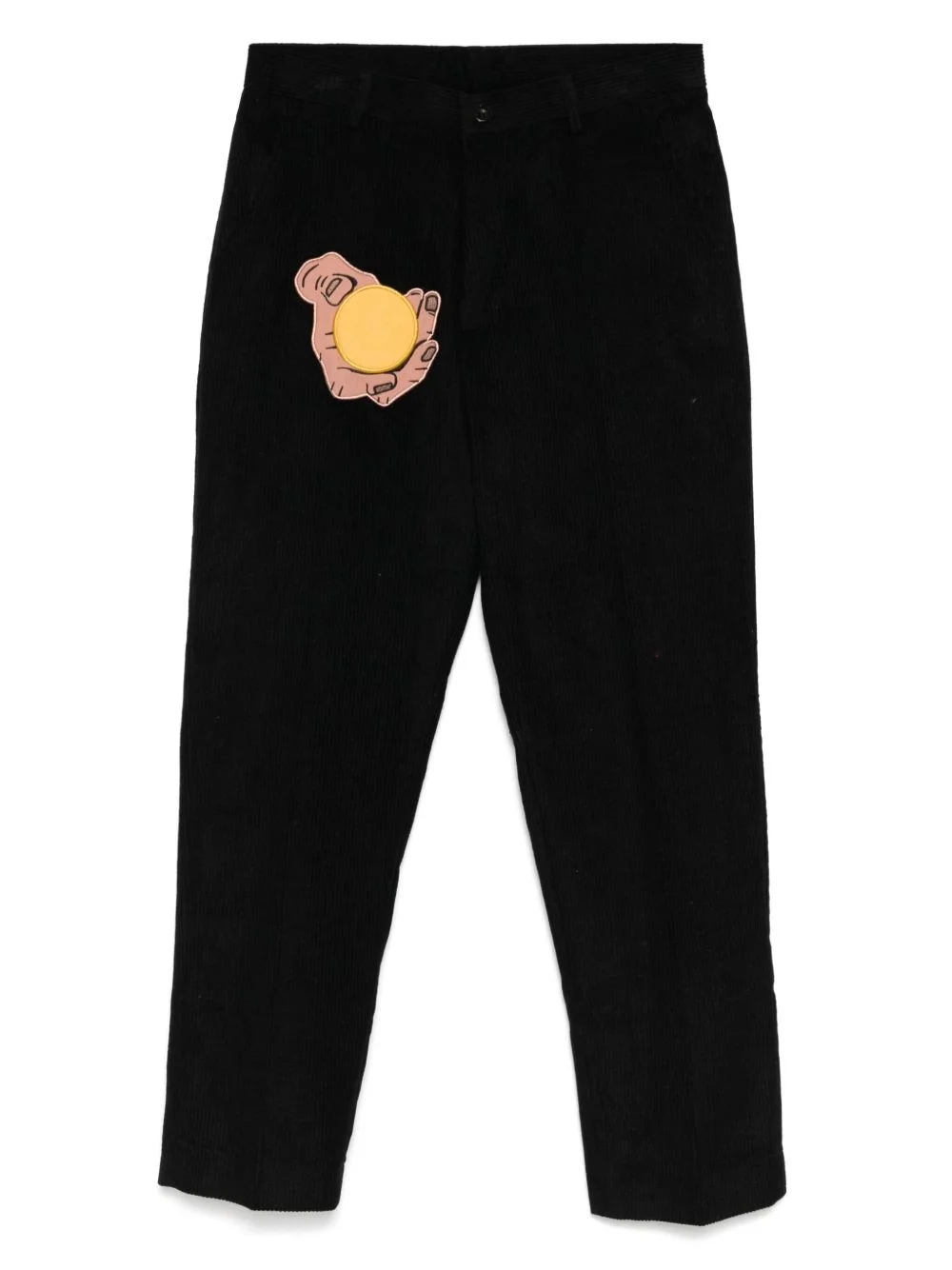 Juggler hands trousers Highlights - Black - Front button and zip fastening - Belt loops - Two side inset pockets Imported Composition Cotton 100% SIZE & FIT Model measurements Height 6 ft 2 in(1.87 m) Bust/Chest 33.07 in(84 cm) Hips 35.43 in(90 cm) Waist 26.77 in(68 cm) FittingInformation Designed for a tapered leg, offering a loose unrestricted fit over the leg with a closer fit towards the ankle Made from a midweight non-stretch fabric