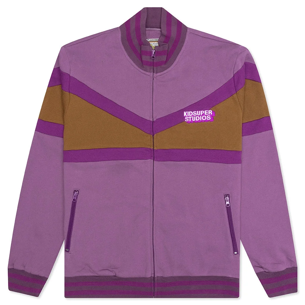 The KidSuper K Tracksuit Top makes an impression on any wardrobe. Composed of a blend of cotton and polyester, the jacket features a full-zip closure in addition to the striped ribbing at the neckline, cuffs, and hem. Embroidered branding can be seen at the chest, while the zippered side pockets and mock neckline wrap up the remainder of the silhouette. KSAW22 03 01 PURP - Cotton/polyester blend - Full-zip closure - Mock neckline - Embroidered branding - Zippered side pockets - Striped ribbed detailing - Style No: KSAW22-03-01