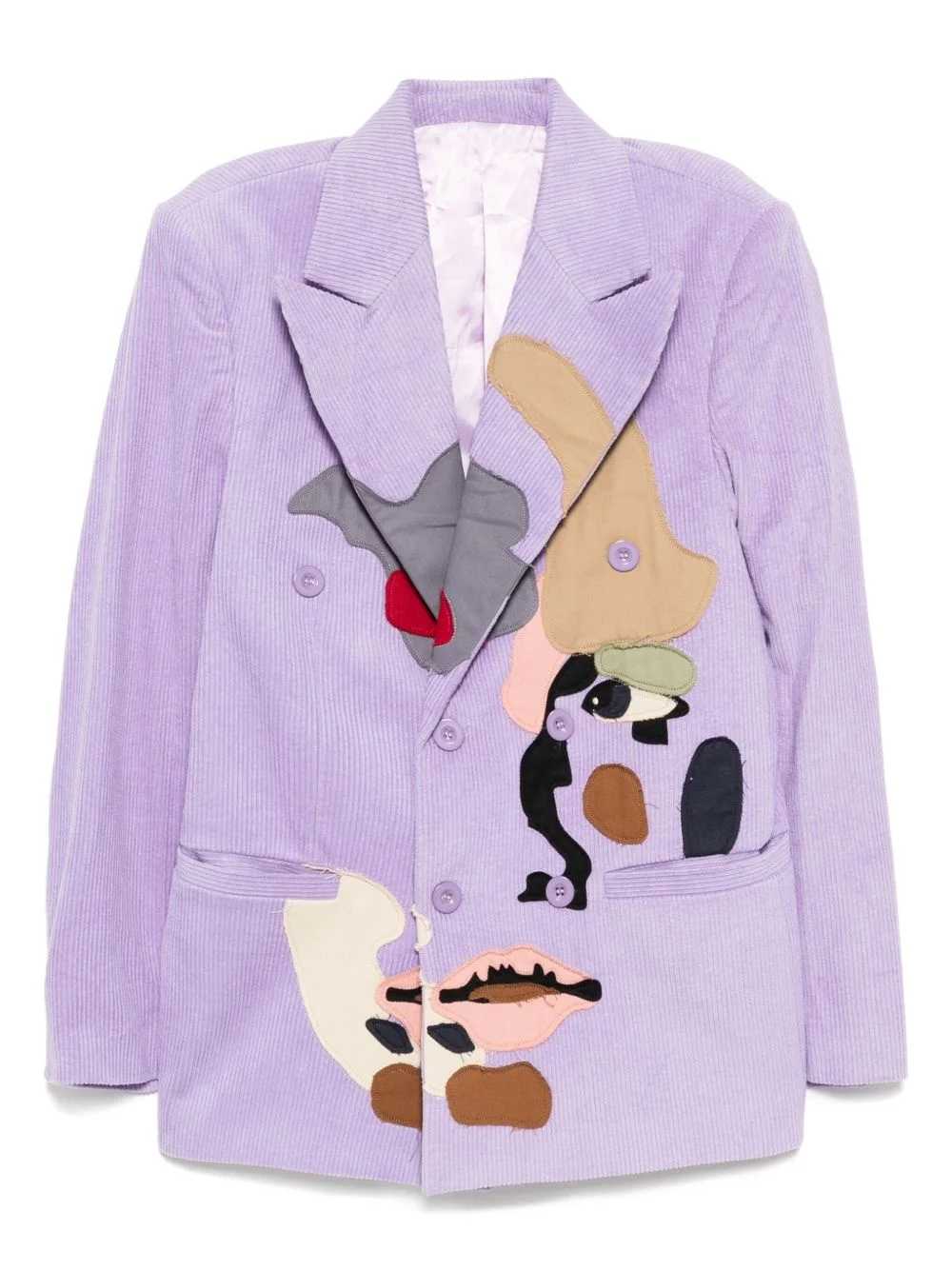 patchwork face corduroy blazer Highlights - Light purple - Double-breasted button fastening - Two front welt pockets - Full lining Imported Composition Lining: Polyester 100% Outer: Cotton 100% SIZE & FIT Model measurements Height 6 ft 2 in(1.87 m) Bust/Chest 33.07 in(84 cm) Hips 35.43 in(90 cm) Waist 26.77 in(68 cm) FittingInformation Designed to be unstructured, offering a loose fit throughout The internal shoulder pads offer a structured shape Made from a midweight non-stretch fabric Washing instructions Dry Clean Only