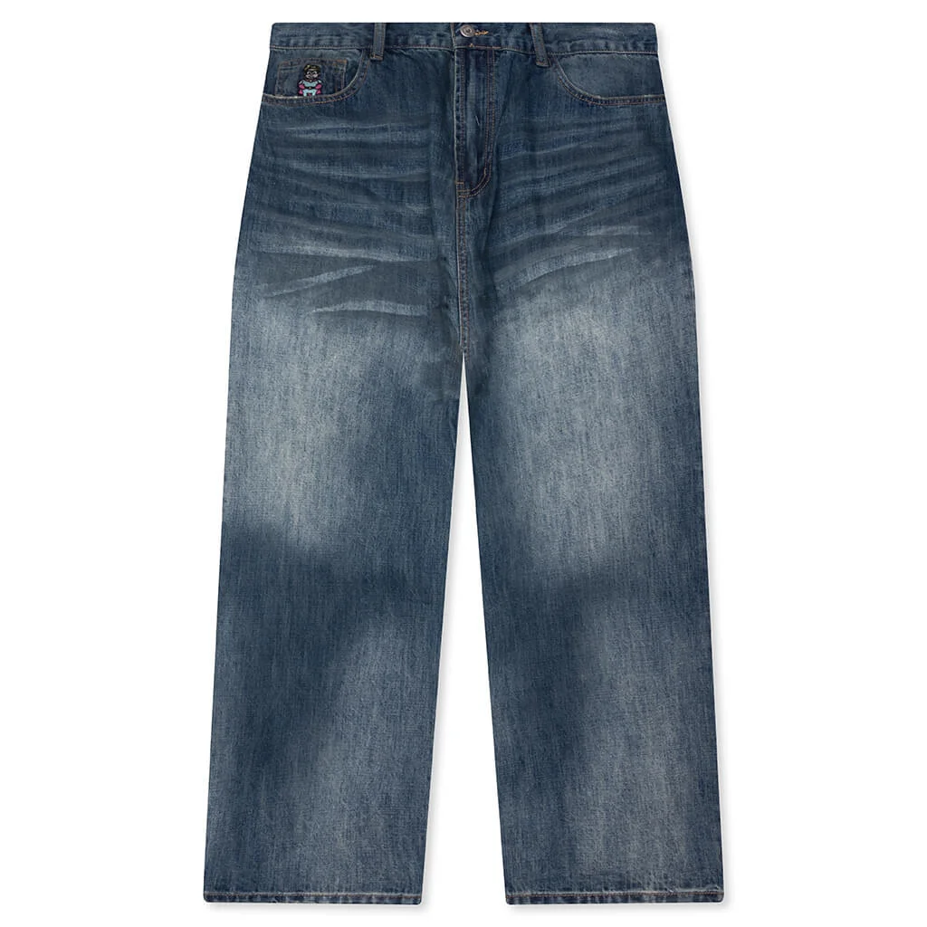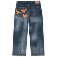 The KidSuper Washed Doves Denim Jeans are constructed from cotton and cut to have a mid-rise and straight leg fit. Classic features include a zip-fly with button closure and five-pocket design. Signature KidSuper artistry is seen through leather dove patches at the back. Finished with the superhero embroidery on the coin pocket and a leather jacron that features KidSuper art. - 100% Cotton - Mid-rise, straight leg - Zip-fly with button closure - 5-pocket design - Superhero embroidery on coin pocket - Lambskin leather dove patches - Leather jacron - Washed treatment - Style No: AW25-PT-26