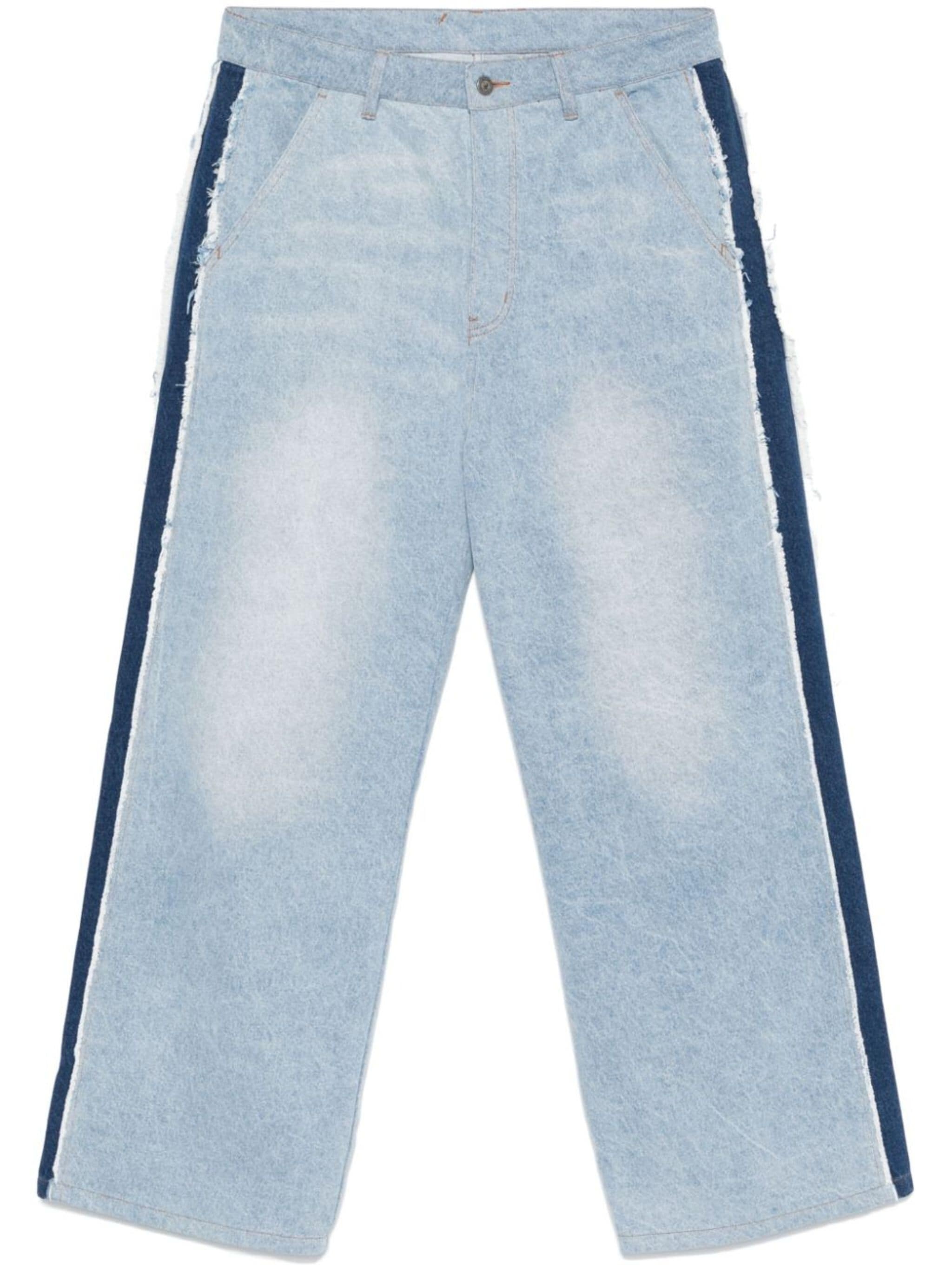 light blue cotton denim side stripe detailing front button and zip fastening frayed detailing to the side belt loops two diagonal pockets to the sides two rear patch pockets number patch to the rear wide leg Size & Fit Model Measurements: Height: 1.85 m Bust/Chest: 93.0 cm Hips: 96.0 cm Waist: 73.0 cm Model wears size M Fabric and Care Designer Style ID: PT09RONALDINHO Designer Colour: blue Composition: Cotton 100% Washing instructions: Machine Wash