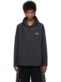 Polyester twill shirt. Check pattern throughout. · Hood at open spread collar · Button closure · Logo and text embroidered at patch pocket · Shirttail hem · Dropped shoulders · Pleat at single-button barrel cuffs · Locker loop at back collar · Twin pleats at back yoke Supplier color: Navy 100% polyester. Made in South Korea 251586M192002