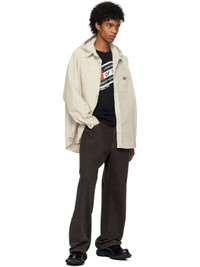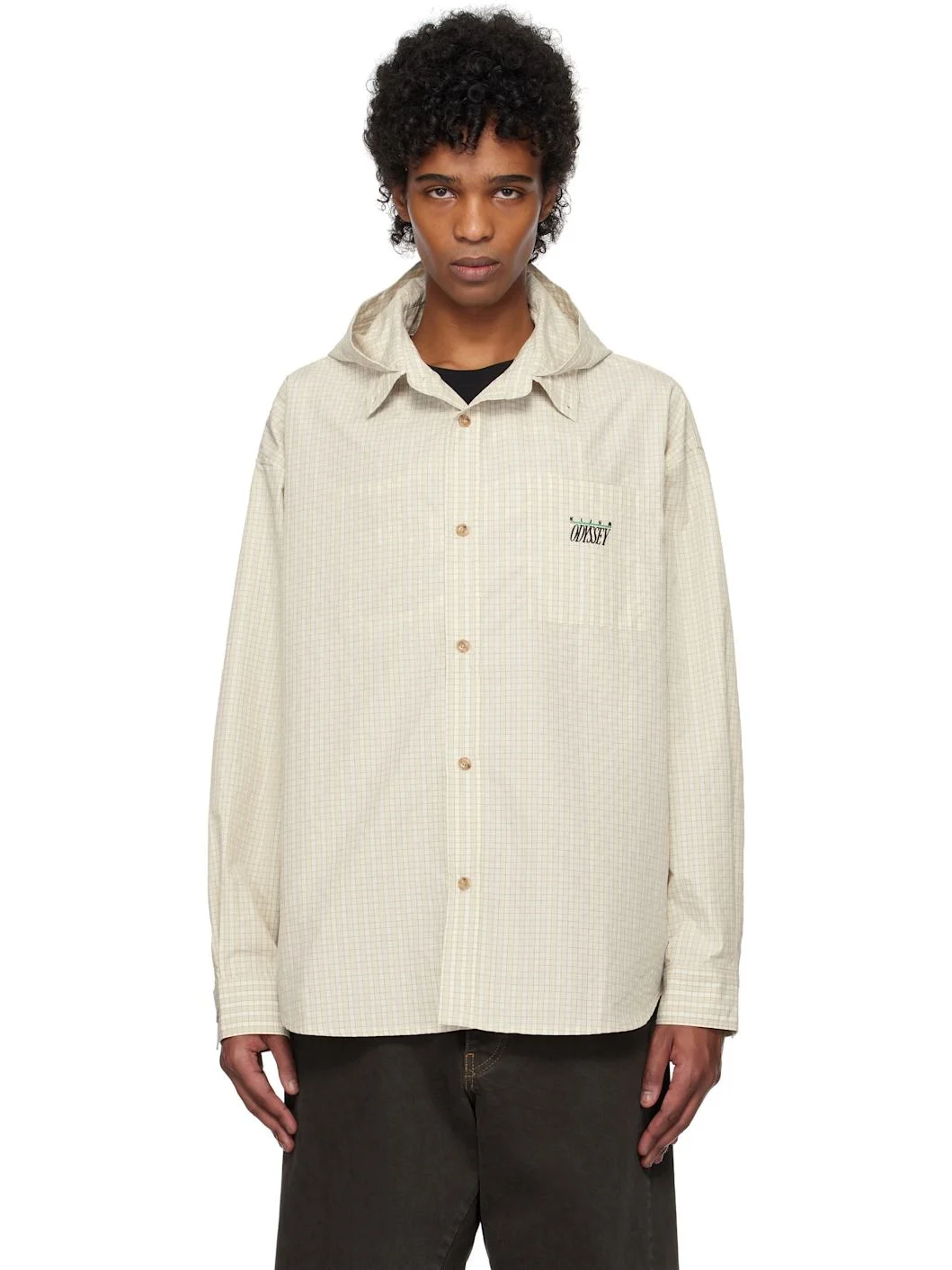 Polyester twill shirt. Check pattern throughout. · Hood at open spread collar · Button closure · Logo and text embroidered at patch pocket · Shirttail hem · Dropped shoulders · Pleat at single-button barrel cuffs · Locker loop at back collar · Twin pleats at back yoke Supplier color: Ivory 100% polyester. Made in South Korea 251586M192004
