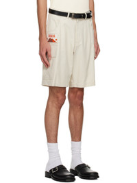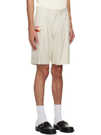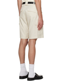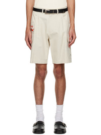 Cotton-blend twill shorts. · Belt loops · Four-pocket styling · Zip-fly · Embroidered logo patch at front · Flap pockets at outseams · Button tab at back waistband Available exclusively at SSENSE. Supplier color: Light beige 54% cotton, 46% rayon. Made in South Korea 231586M193003