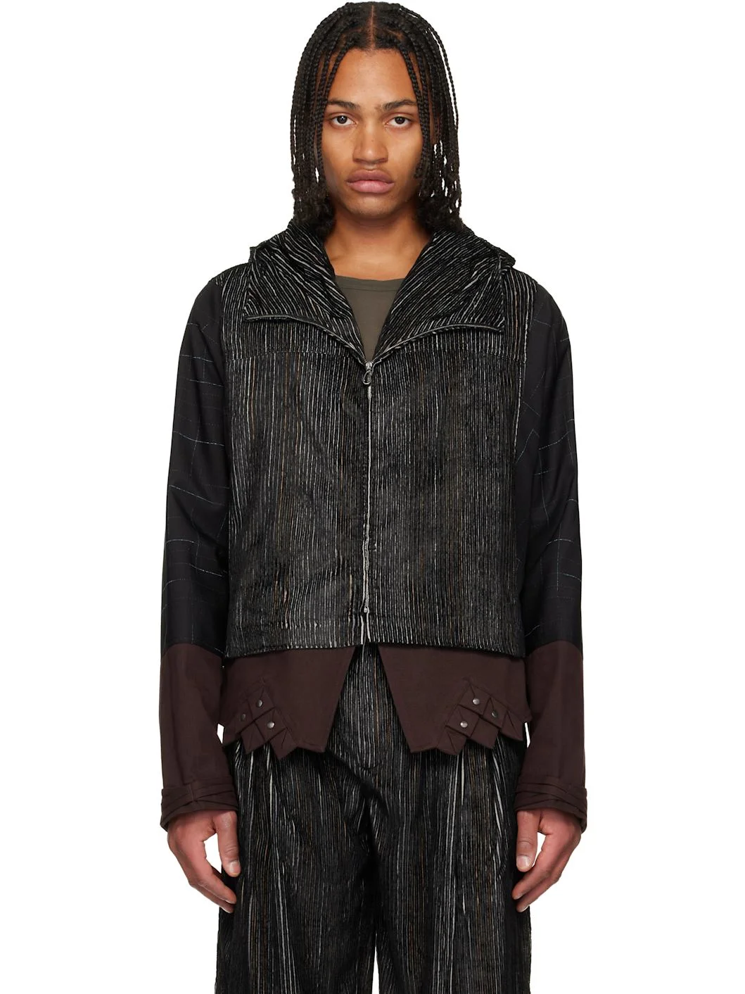 Paneled silk-blend corduroy and virgin wool-blend barathea jacket. · Check and herringbone pattern throughout · Stand collar · Zip closure · Seam pockets at waist · Adjustable button tabs at cuffs · Pleated panels with rivets at hem · Welt pockets at interior · Full satin lining Supplier color: Black/Brown Body 1: 59% silk, 41% viscose. Body 2: 98% virgin wool, 1% polyester, 1% polyamide. Trim: 100% cotton. Lining: 100% viscose. Made in Bulgaria 252985M180010