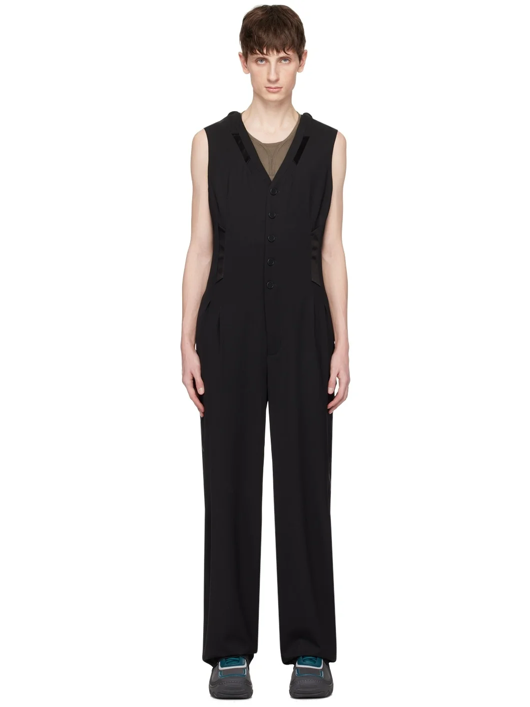 Stretch virgin wool gabardine jumpsuit. Satin trim throughout. · Y-neck · Button closure · Darts at front and back · Two-pocket styling · Zip-fly · Pleats at front · Concealed button fastening at shoulder straps Supplier color: Black Body: 97% virgin wool, 3% elastane. Trim: 53% cotton, 47% acetate. Made in Bulgaria 241985M191007