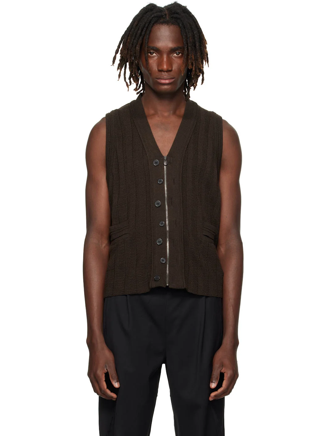 Rib-knit virgin wool- and silk-blend vest. · V-neck · Zip closure with button placket · Welt pockets at front Supplier color: Maroon 90% virgin wool, 10% silk. Made in Bulgaria 252985M200001