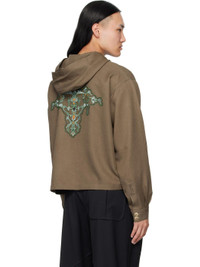Woven hoodie. · Four-button placket · Topstiched panel at chest · Buttoned kangaroo pocket at waist · Embroidered logo at buttoned cuffs · Chain-stitched graphic at back Supplier color: Sepia 100% polyester. Made in Bulgaria 252985M202000