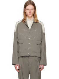 Stretch virgin wool twill blazer. · Spread collar · Zip closure with button placket · Embroidered detailing at chest and side seams · Flap pockets at front · Adjustable button tab at hem side seams · Striped applique at raglan sleeves · Partial twill lining Supplier color: Slate grey/Ivory hunter stripe Body: 97% virgin wool, 3% elastane. Trim: 100% cotton. Lining: 65% polyester, 35% cotton. Made in Bulgaria 252985M195003