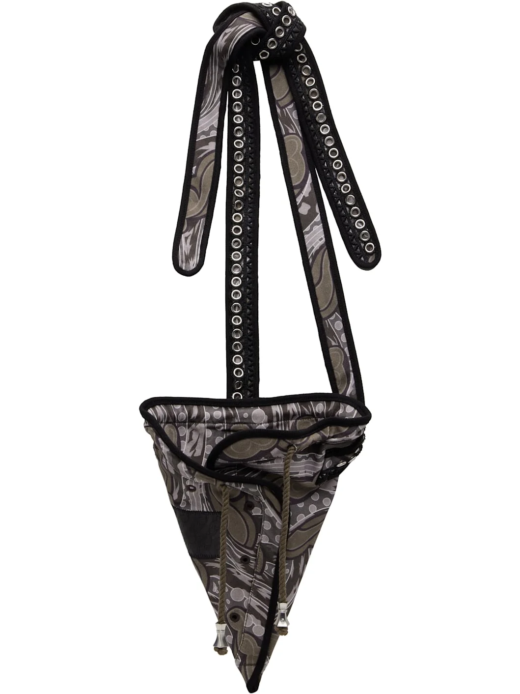 Cotton jersey messenger bag. · Rib-knit trim and graphic pattern throughout · Self-tie crossbody strap · Grommets and embroidered detailing at strap · Eyelets and logo patch at face · Drawstring closure · H11" x W8" x D6" Supplier color: Iron/Black Textile. Made in Portugal 261985M170004