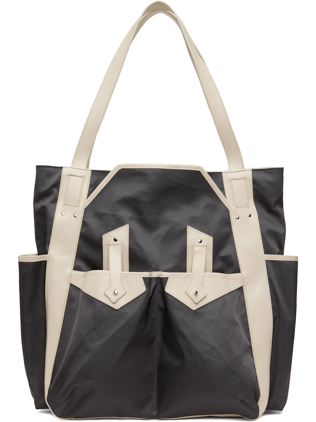 Buffed calfskin and nylon taffeta tote in gray and off-white. - Paneled construction - Twin shoulder straps - Patch pockets and post-stud tabs at face - Patch pocket at sides - Zip closure - Zip pocket and patch pockets at interior - Nylon taffeta lining - H18 x W15 x D6 Supplier color: Dark grey/Sand