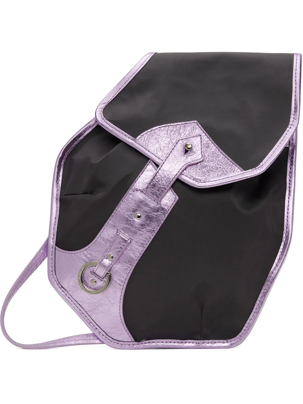 Grained calfskin and nylon taffeta messenger bag in gray and metallic purple. · Asymmetrical construction · Logo-engraved keyring at face · Press-stud hardware at back face · Post-stud flap · Nylon taffeta lining · H13" x W10" Supplier color: Dark grey/Fossil Calfskin, textile. Made in Portugal 251985M170002