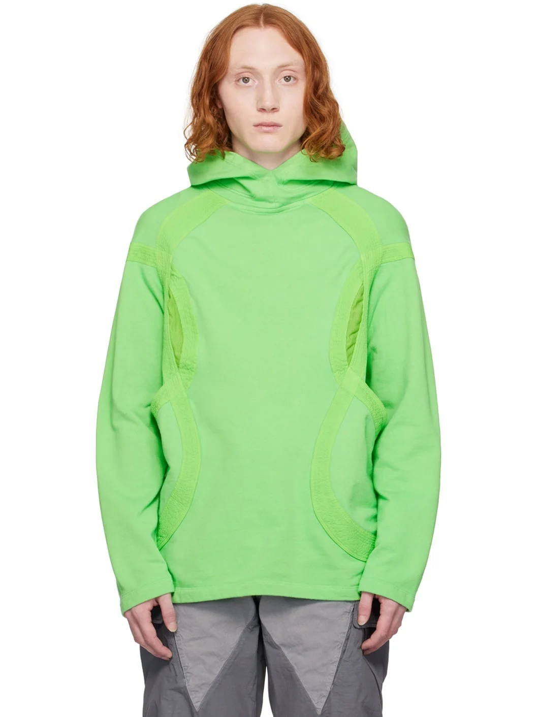 Garment-dyed French terry hoodie. Quilted Flatt crinkled nylon taffeta trim throughout. · Hood at stand collar · Stretch nylon mesh inserts at chest · Patch pockets · Droptail hem · Raglan sleeves Part of the Kiko Kostadinov x C.P. Company collaboration. Supplier color: Green flash Body: 100% cotton. Trim 1: 100% polyamide. Trim 2: 67% polyamide, 33% elastane. Made in Romania 241985M202002