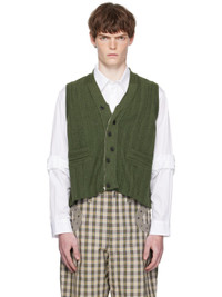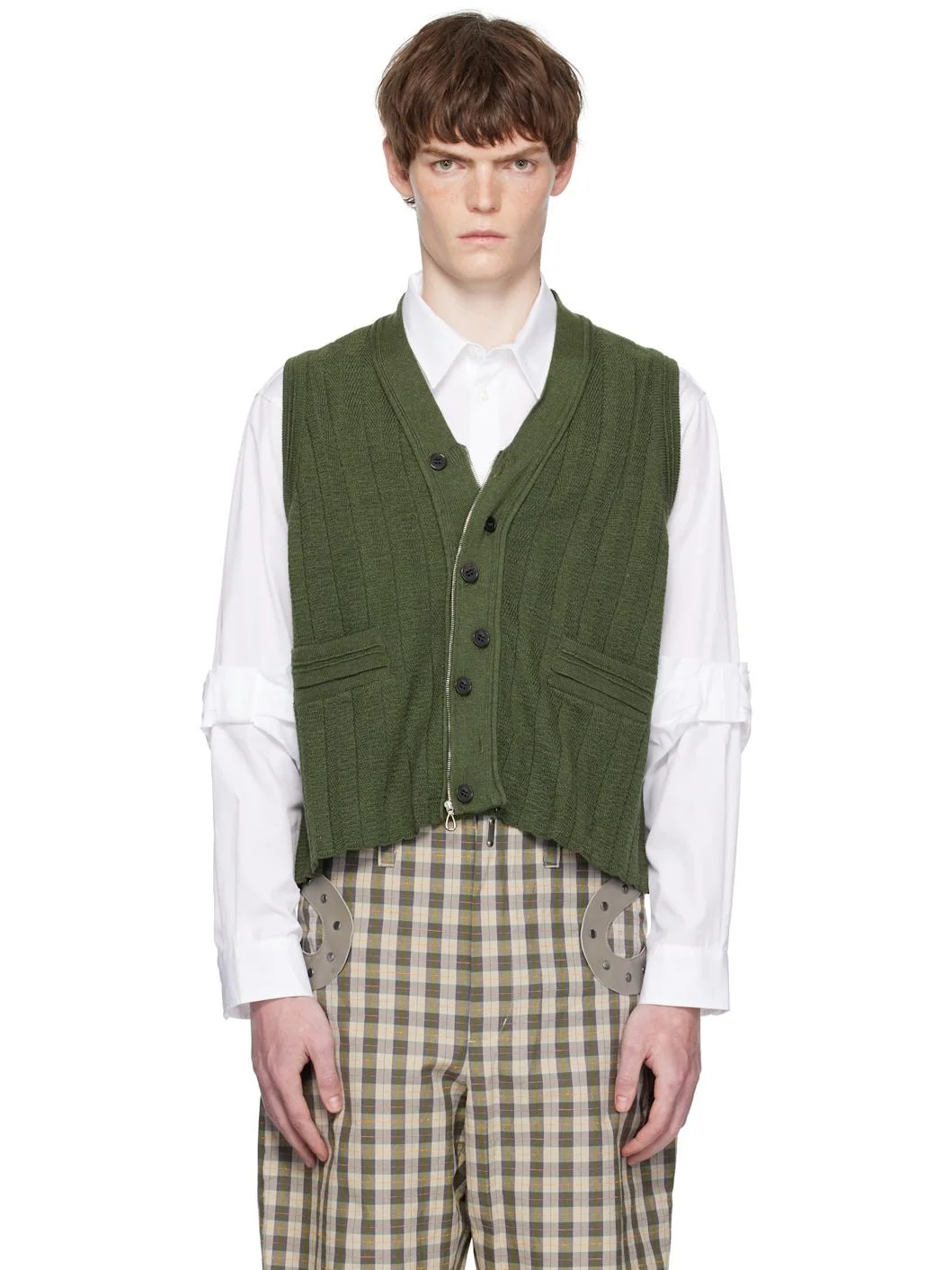Rib-knit virgin wool-blend vest. · Y-neck · Zip closure with button placket · Welt pockets at front · Scalloped edge at cropped hem Supplier color: Juniper green 90% virgin wool, 10% silk. Made in Bulgaria 252985M200000