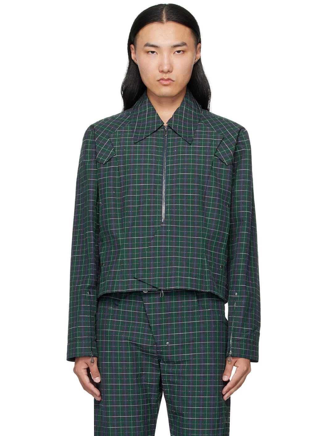 Heavyweight cotton-blend oxford cloth jacket. · Woven check pattern throughout · Spread collar · Overlayed panels at front · Two-way zip closure · Zip pockets at waist · Zip placket at cuffs · Full poplin lining Supplier color: Forest Check 97% cotton, 1% linen, 1% nylon, 1% viscose. Made in Bulgaria 252985M180006