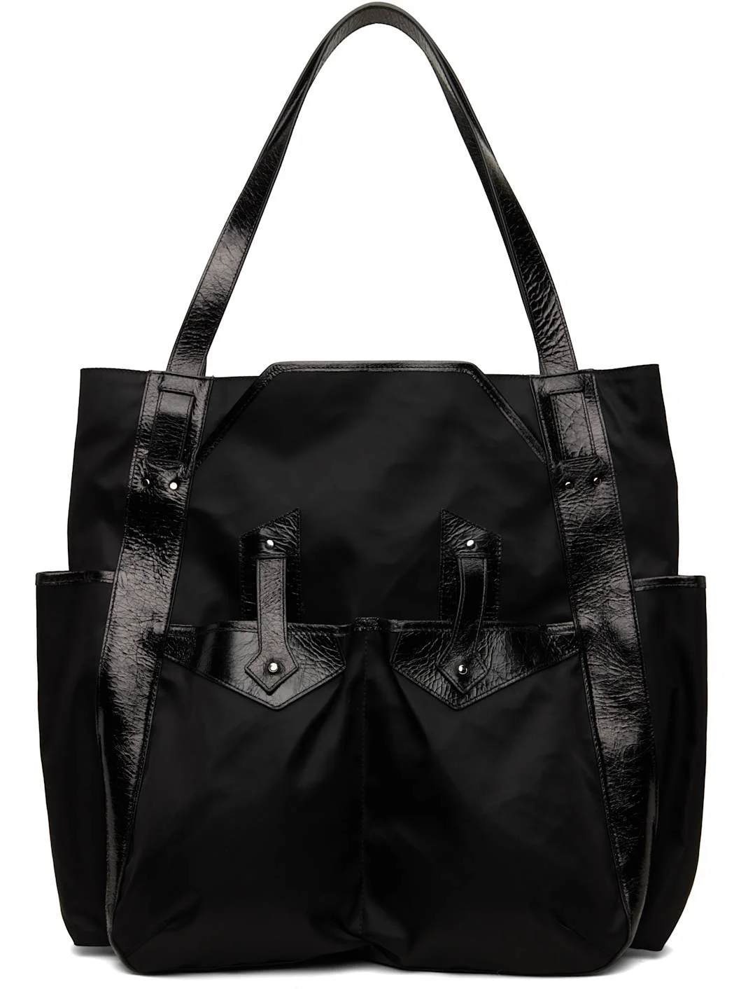 Crinkled calfskin and nylon taffeta tote in black. · Paneled construction · Twin shoulder straps · Patch pockets and post-stud tabs at face · Patch pocket at sides · Zip closure · Zip pocket and patch pockets at interior · Nylon taffeta lining · H18" x W15" x D6" Supplier color: Black Calfskin, textile. Made in Portugal 251985M172001