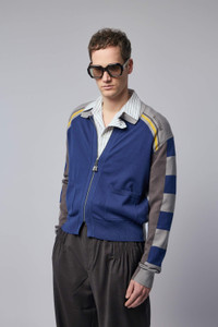 SKU: 155862 Brand style: KKSS26KN02-102 Bomber Jacket with bold color contrasts, featuring a zip-up front and stripe details. The jacket combines blue and grey tones with yellow accents, creating a dynamic visual appeal. - Zip-up front closure - Two front pockets - Contrast stripe sleeves - Blue and grey color scheme - Yellow accent detail - Ribbed cuffs and hem - Collared neckline Materials: 100% Cotton Color: Navy & Anchor The model is 1.86m (6.1ft) and wears a size EU48. The item fits as expected according to standard sizing. Order your usual size.